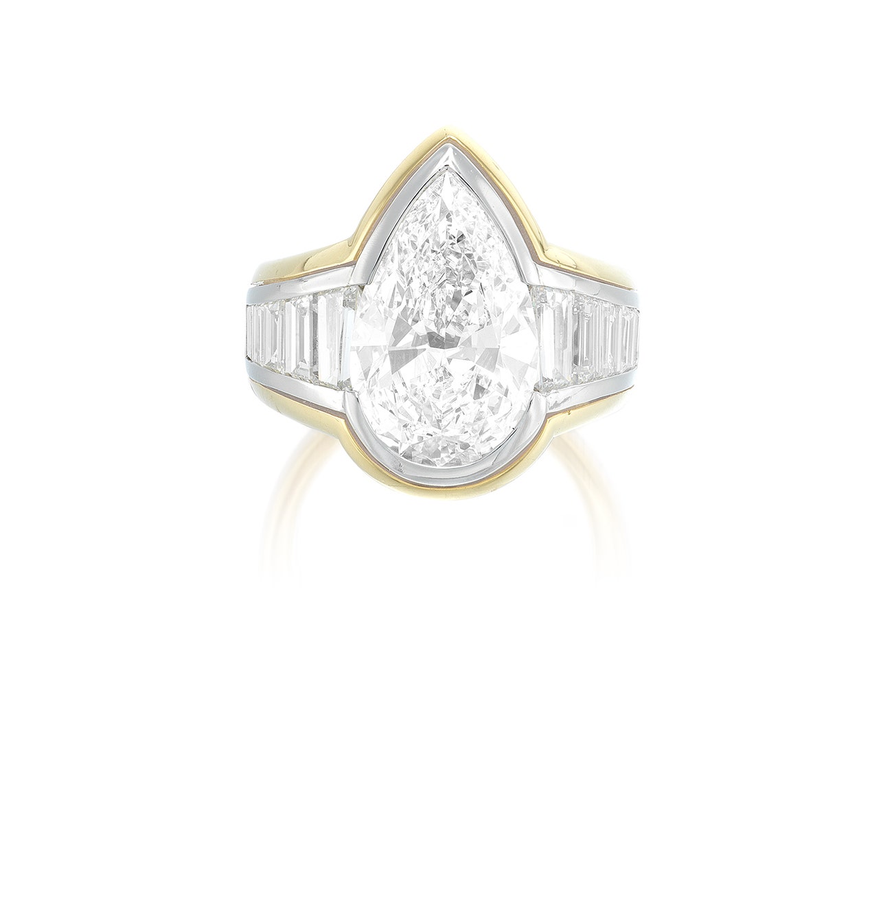 Bezel set with a pear-shaped diamond weighing approximately 5.69 carats, the shoulders enhanced with baguette diamonds, mounted in platinum and gold, size 6¾.