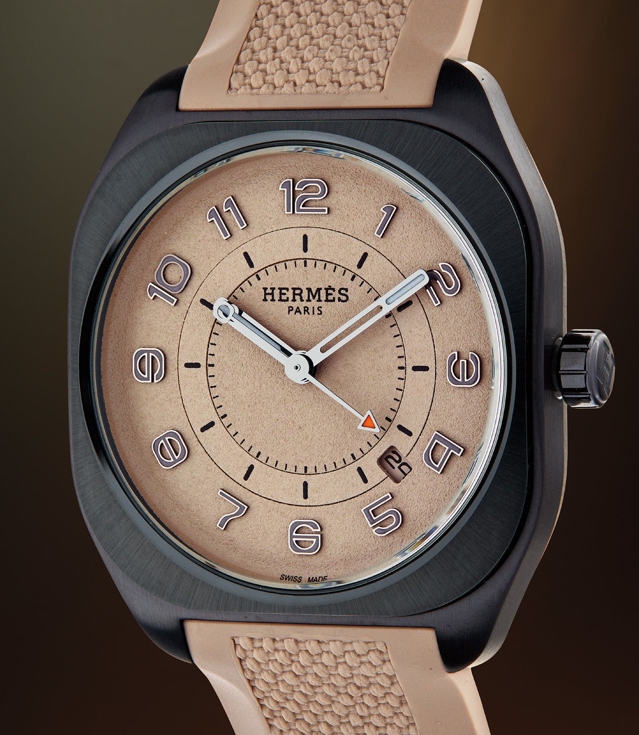 The multilayered dial is rendered in taupe for a one-of-a-kind monochromatic effect that's further complemented by a matching taupe textured silicone strap for all-around comfort and utility. The numerals are a custom Hermès creation, while the arrow-tipped seconds hand incorporates a splash of the company's signature shade of orange. Inside is the mechanical self-winding Hermès Manufacture caliber H1837 movement.