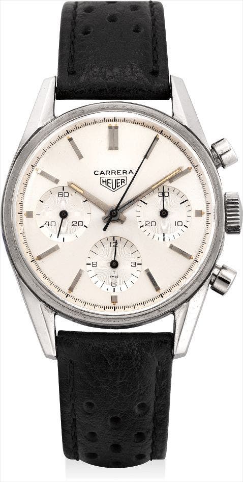 The name Carrera originates from the 'Carrera Panamerica', a thrilling car race which takes place in Mexico. Jack Heuer's main goal when creating the Carrera was to have something absolutely legible when timing car races. The present example is an extremely clean and easy to read chronograph from the early days of the Carrera.