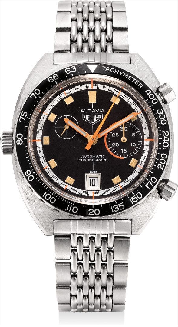 Heuer,精細及罕有,不銹鋼自動上弦鏈帶腕錶,配計時功能、日曆顯示及Gay Frères鏈帶,“Autavia”,型號1563 Exotic,約1974年製