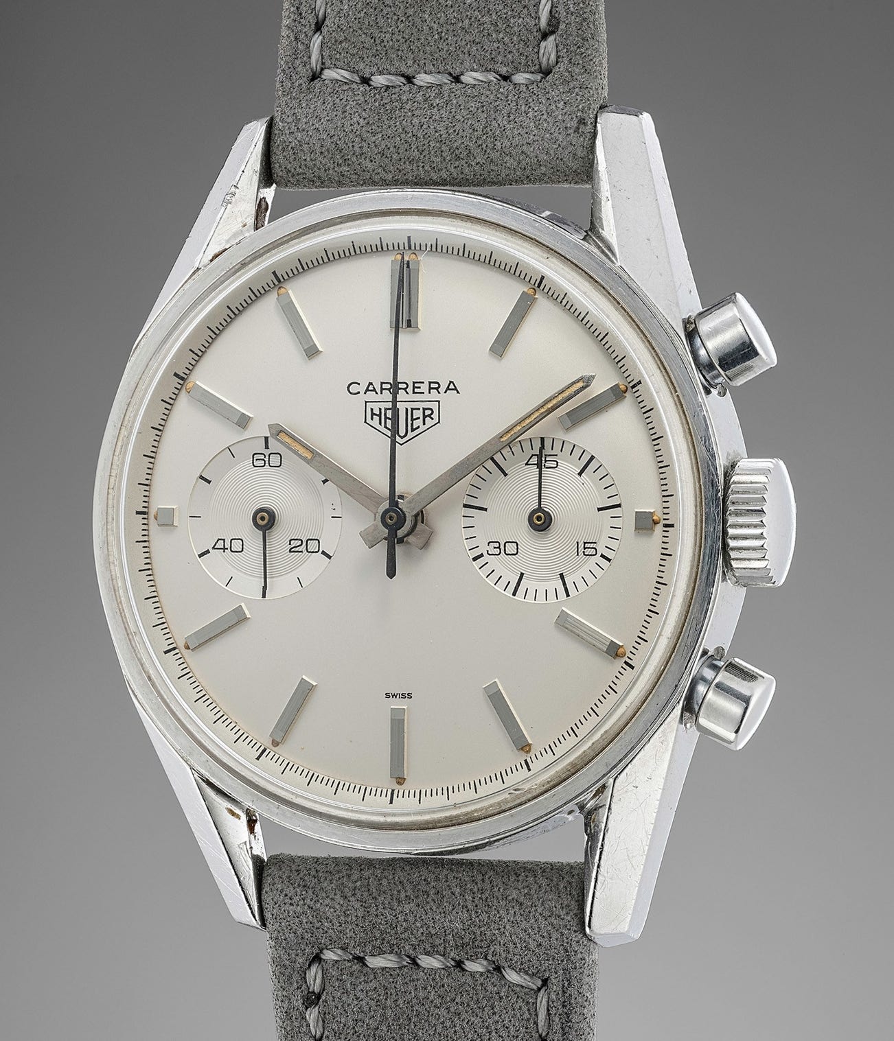 The present example is a well-preserved early first execution reference 3647 with two registers. It was nicknamed Carrera 45 because it features a 45-minute register as opposed to the 12-hour register of the Carrera 12. This double register wristwatch was advertised by Heuer as ideal for football enthusiasts and professionals.