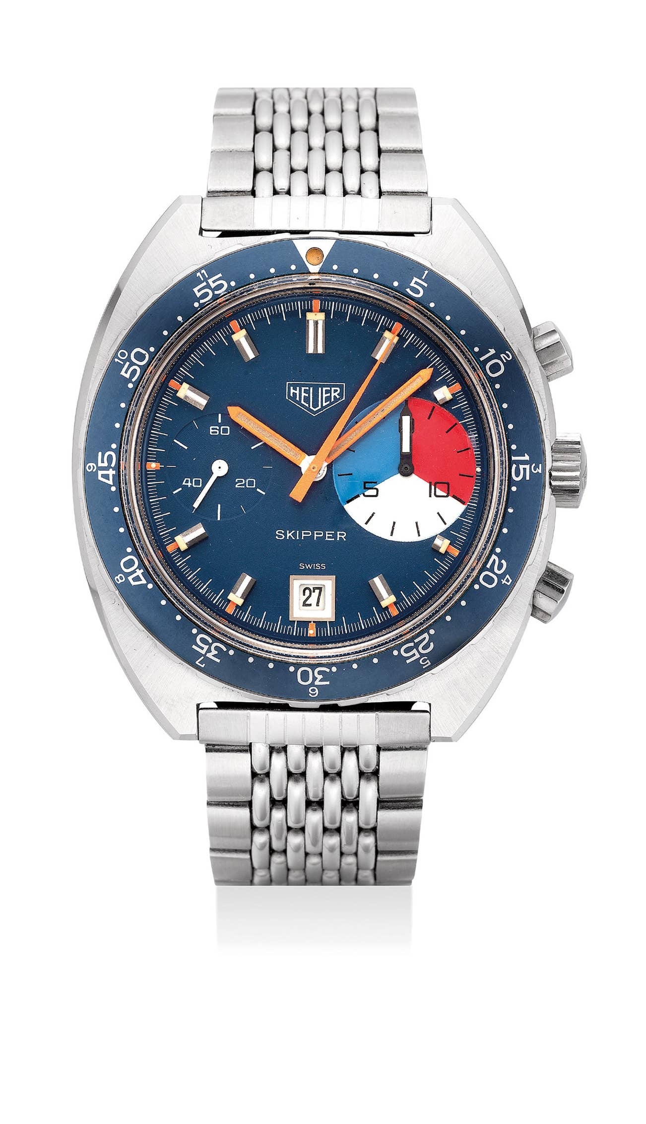豪雅,「Skipper」型號73463,非常罕有及精細,精鋼鏈帶腕錶,配「Gay Frères」鏈帶﹑計時功能和日期顯示,約1972年製