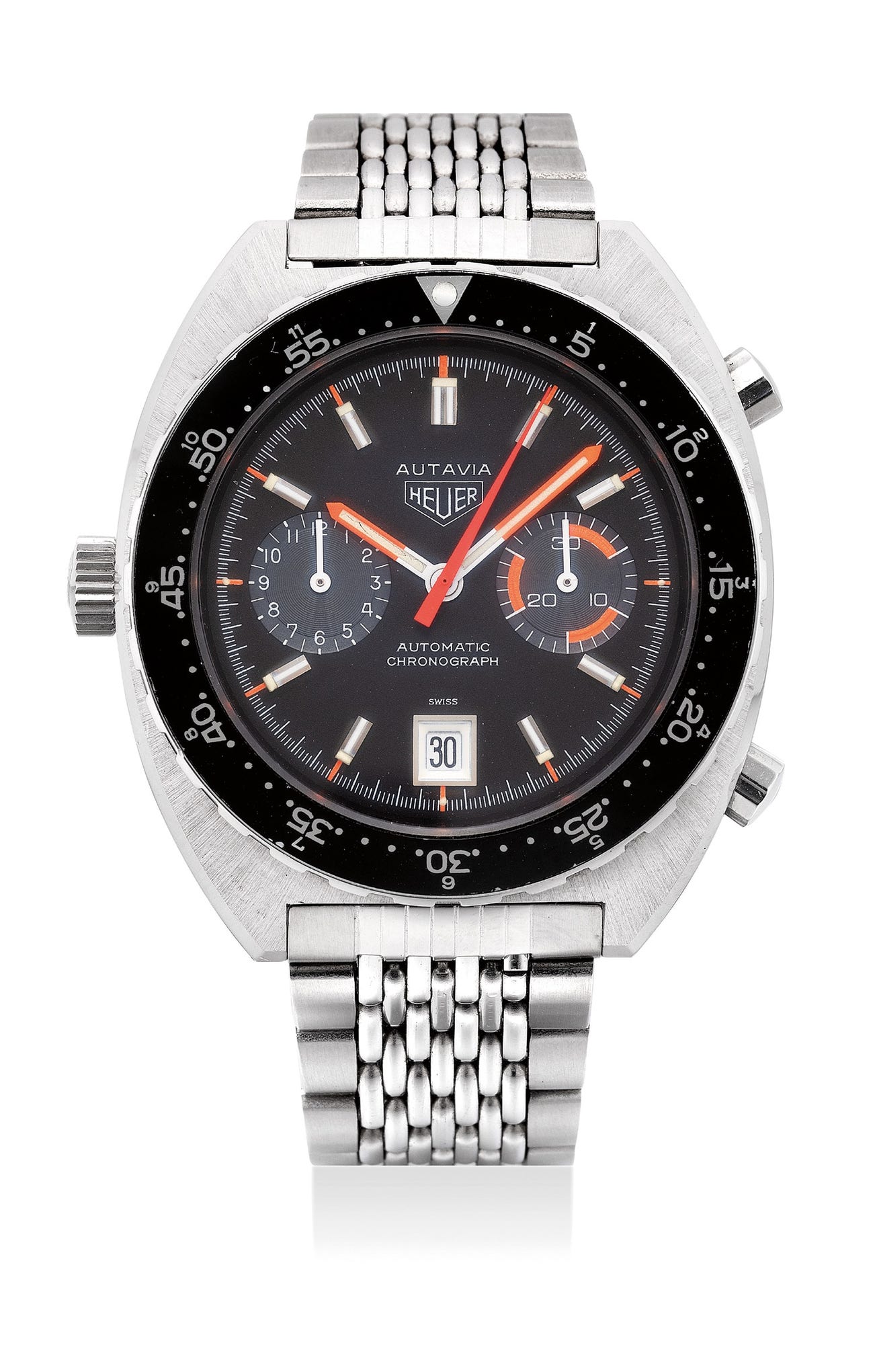 豪雅,「Autavia」型號11630,罕有及十分精細,精鋼自動上弦鏈帶腕錶,配計時功能和日期顯示,約1970年代製