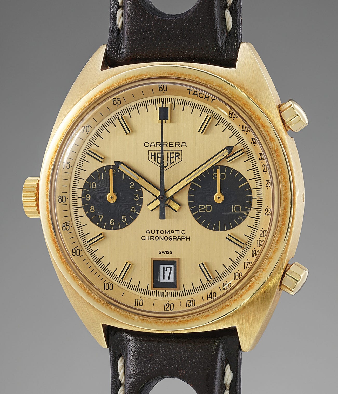 The present watch is a particularly nice and well preserved example. Powered by the automatic caliber 12, the crown has been moved from the right to the left of the case as it is used only to set the time. This particularity would allow a more comfortable wear and differentiated the manual winding watches from the automatic ones. It features two black subdials that are nicely completed with a silver date. At the time, reference 1158CHN was available with either a black or silver date. By combining Heuer's strong sporty DNA with a dressy and elegant 18K yellow gold case, this watch embodies the glamorous era of the race track in the 1970s.