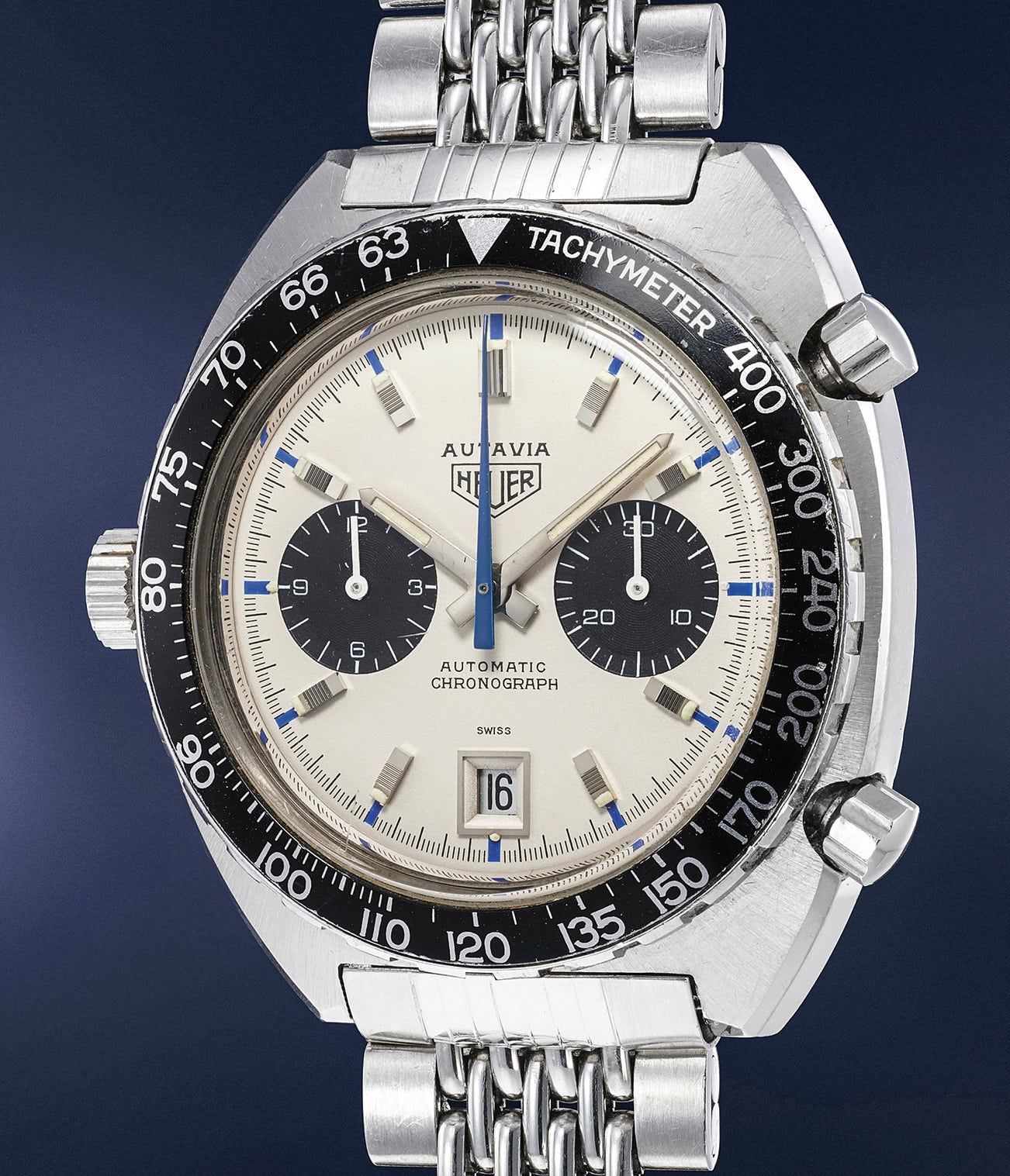 The Autavia was the timepiece of choice for many famous Grand Prix drivers during the 1960s and 70s. Amongst them was Jo Siffert, the Swiss double Formula 1 Grand Prix champion who wore an Autavia 1163 with tachymeter scale, white dial with black registers, date and blue seconds chronograph hand and markers, explaining this lot’s nickname. Siffert himself was known for driving a Porsche 917, the replica of which is offered in this lot.