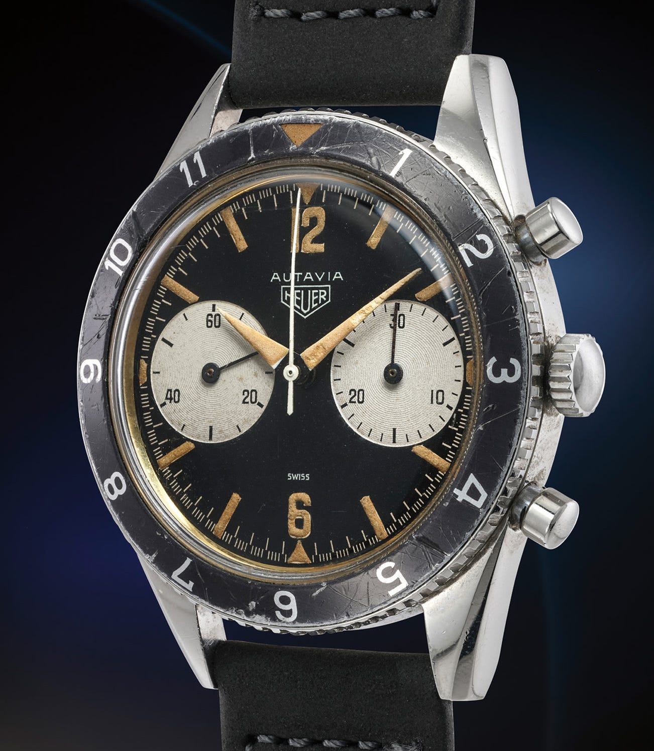 The present Autavia "Big Sub" with 1st execution dial is preserved in excellent overall condition - the case retains its original proportions and the numbers between the lugs are crisp. The watch exhibits all the correct first series reference 3646 attributes; large subdials, shallow Ed. Heuer "one-step" case back, small pushers and dome crown. The rotating hour division bezel (with lume piece) was yet another invaluable instrument for professionals. Marketed originally as for pilots, sportsmen, divers and scientists the present timepiece is a rare opportunity for collectors of historically important chronographs and definitely an opportunity not to be missed.