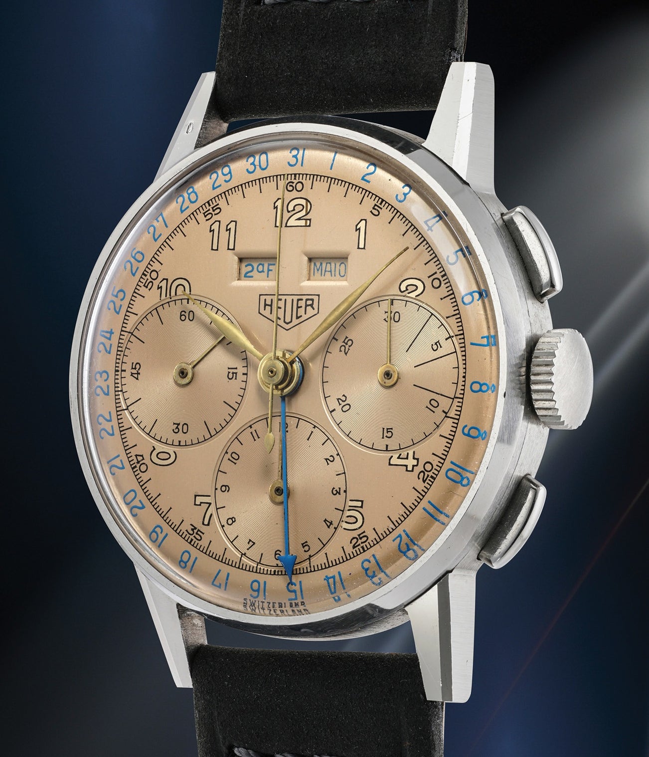 The present Heuer is a triple calendar chronograph and brings immense value to the wearer and is a sight to behold. Not only a complicated timepiece, it is distinguished by its extremely impressive and virtually unpolished condition - traits that are virtually unheard of today, particularly because most Heuer timepieces were originally purchased to be used as tool watches. The condition of this timepiece is incredible - the lugs are incredibly sharp with crisp beveling, and the contrasting polished and brushed finishes are undoubtedly original, and display how the timepiece originally left the factory. Furthermore, there is a crisp Portuguese import mark stamped on the upper left lug. It would have disappeared if the watch had been re-polished in any way. The stunning and incredibly rare salmon dial barely shows any sign of aging, and the case remains as crisp as it was the day it left the factory. Such gems hardly appear on the market, no less is such untouched and original condition.