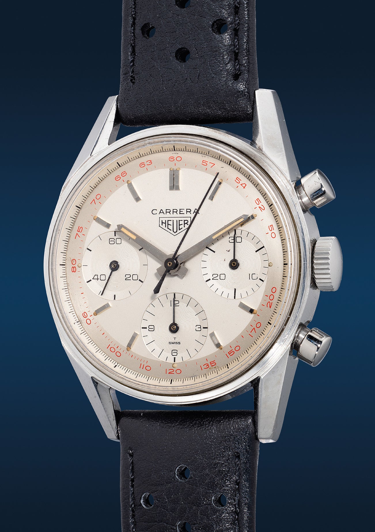 Born on the racetrack in 1963, the Carrera reference 2447 is one of Heuer’s most iconic designs and was Jack Heuer’s most passionate creation. Over the course of production, a variety of dials were available; panda, reverse panda, with or without tachymeter scale. The size of subdials and shape of hour markers also changed. While early dials can be categorized with the SWISS only insignia at 6 o’ clock, variants from 1965 onwards will bear a T SWISS indicating the use of tritium for the luminous materials.