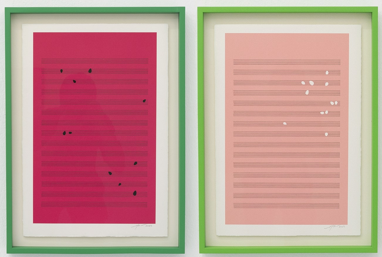 In this playful artwork, Hu Qiren poses the question: “What would you do with a watermelon full of seeds?”. Paying homage to the Fluxus movement, which encouraged people to actively partake in creative activity, Melon Tunes prompts audience participation with lyrical humour. The black and white melon seeds scattered across the pages form chance compositions and accidental music scores that are both visually and aurally stimulating.