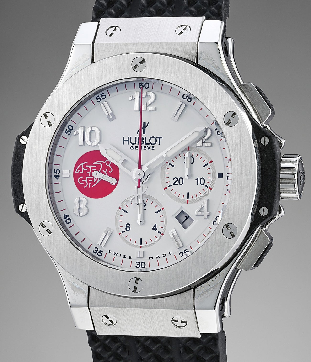 In 2007, Hublot made a limited edition of 300 pieces specially for the high ranked managers of the ASF : "Association Suisse de Football" (Swiss Football Association). The Big Bang “ASF” is the fusion between ceramic, stainless steel, Kevlar and rubber. The dial has been customized to proudly display the red ASF logo as the third subdial. The caseback is also fitted with the large red logo and the side of the case is further adorned by the Swiss cross beautifully contrasting against the polished stainless steel and black ceramic.
