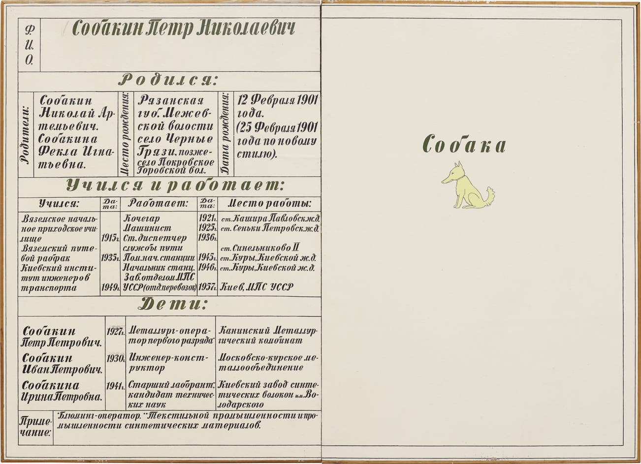This derogatory nickname implies that Peter Nikolaivich lived the life of a dog, which is recounted here in its stark entirety as to his lineage, education, work history and offspring. It is a summary of his life from society’s point of view: his biography is outlined, and his most important achievements are listed. The way his biography is presented, the monumentality of the painting and its bureaucratic appearance imply that this man’s life must have been rather exemplary. The biography of Sobakin conceals a sort of educational purpose, an encouragement for the audience to live such a life as well. However, Kabakov diminishes all these traits of Peter Nikolaivich with irony: nothing of this sort can be said about a dog, since it doesn’t have a history or biography, it is merely a dog.