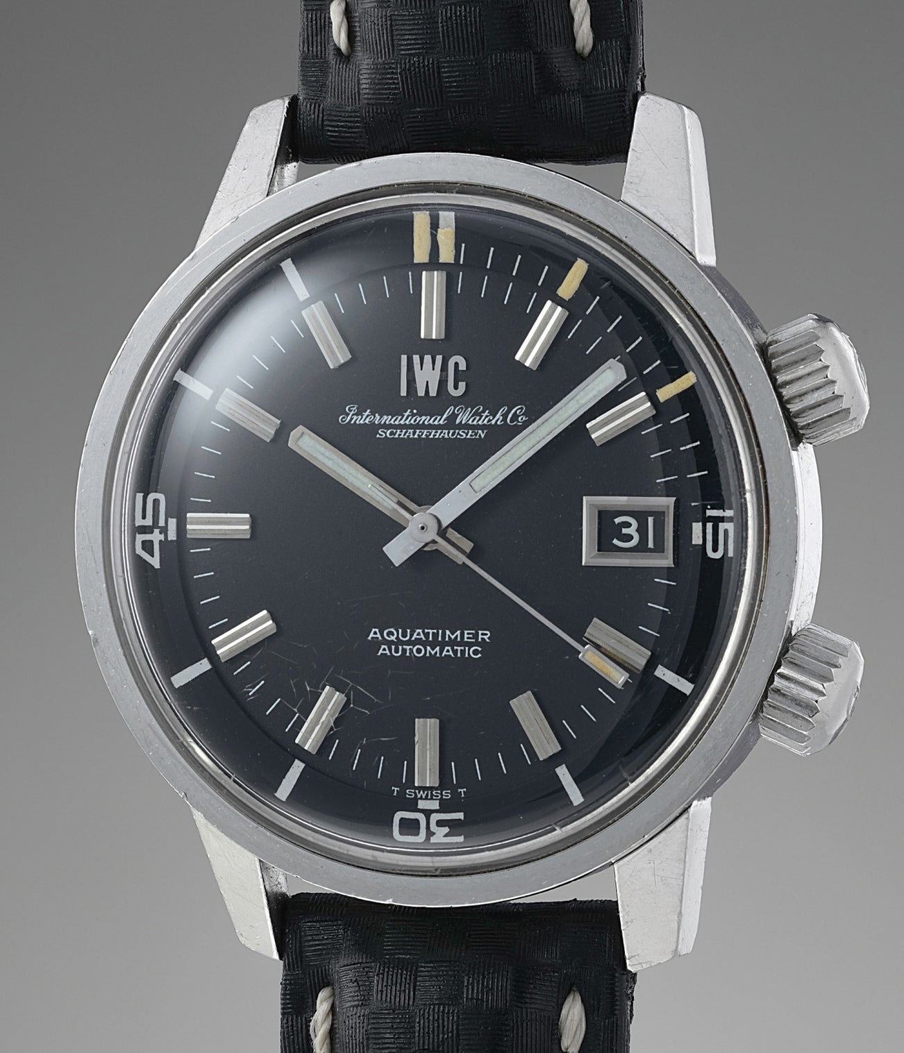 Some of the most important dive watches of the 20th century were introduced in the mid 1950s following World War II, incorporating technological advances developed during the war. A late entrant to this market was IWC. While they followed nearly a decade after others, the Aquatimer remains a distinguished model for both its aesthetics and engineering excellence. Released in 1967 and produced in far fewer examples than competing dive watches, the reference 812 AD is an iconic IWC watch for connoisseurs. The Aquatimer has a modern, sleek appeal with a ‘super compressor’ case that has less bulk compared with other dive watches of the era. A timing ring placed underneath the crystal replaces the outer rotating bezel. This works as a safety mechanism, keeping the bezel from being bumped and accidentally changing the time, as well as giving the watch a flatter profile. Further, the in-house caliber 8541 movement features the innovative “Pellaton” winding system, patented by IWC in 1950. This horological innovation uses a bi-directional rotor improved efficiency, giving greater winding power.