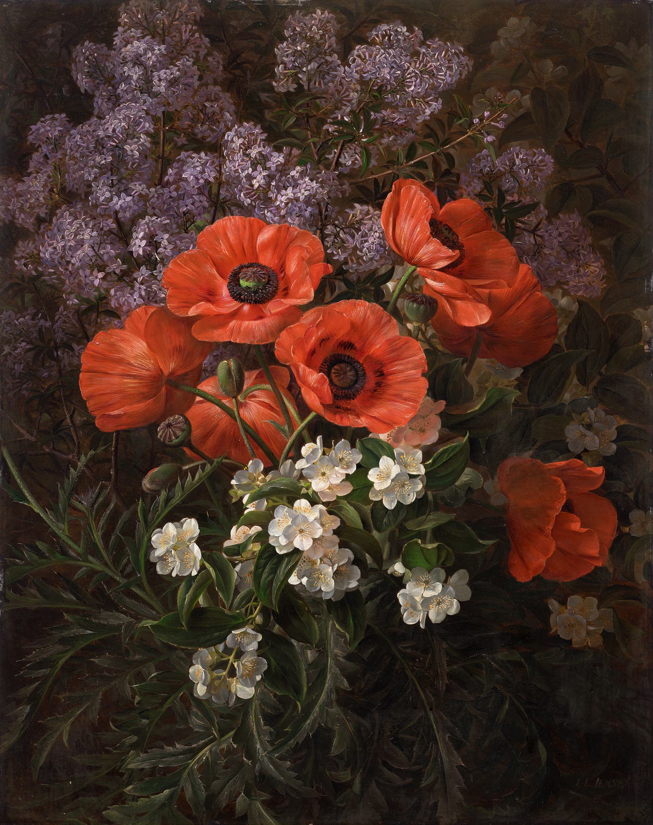 Danish | B. 1800 D. 1856Known as ‘Blomster-Jensen’ from an oeuvre consisting of thousands of flower paintings, Johan Laurentz Jensen (1800-1865) was foundational to the Danish botanic tradition. Admitted to the Danish Academy by age fourteen, Jensen learned his craft from C.D. Fritzsch, before exhibiting in 1818 in the Academy’s annual exhibition at Charlottenborg. Drawing inspiration from the Dutch flower painting tradition of, for instance, Jan van Huysum, Jensen created tightly structured yet decorative floral compositions animated by non-naturalistic light, and often favouring the Dutch pyramid structure. This was subject matter which suited bourgeoisie patrons, used for decoration in the domestic sphere. It also enabled Jensen to maintain a scientific exactitude to these natural studies, whilst also conveying National Romantic undertones which dominated at the time. Although his work has only been revealed over the last two decades in art historical study, he undoubtedly shaped both the aesthetic direction and institutional foundations of nineteenth century Danish flower painting.