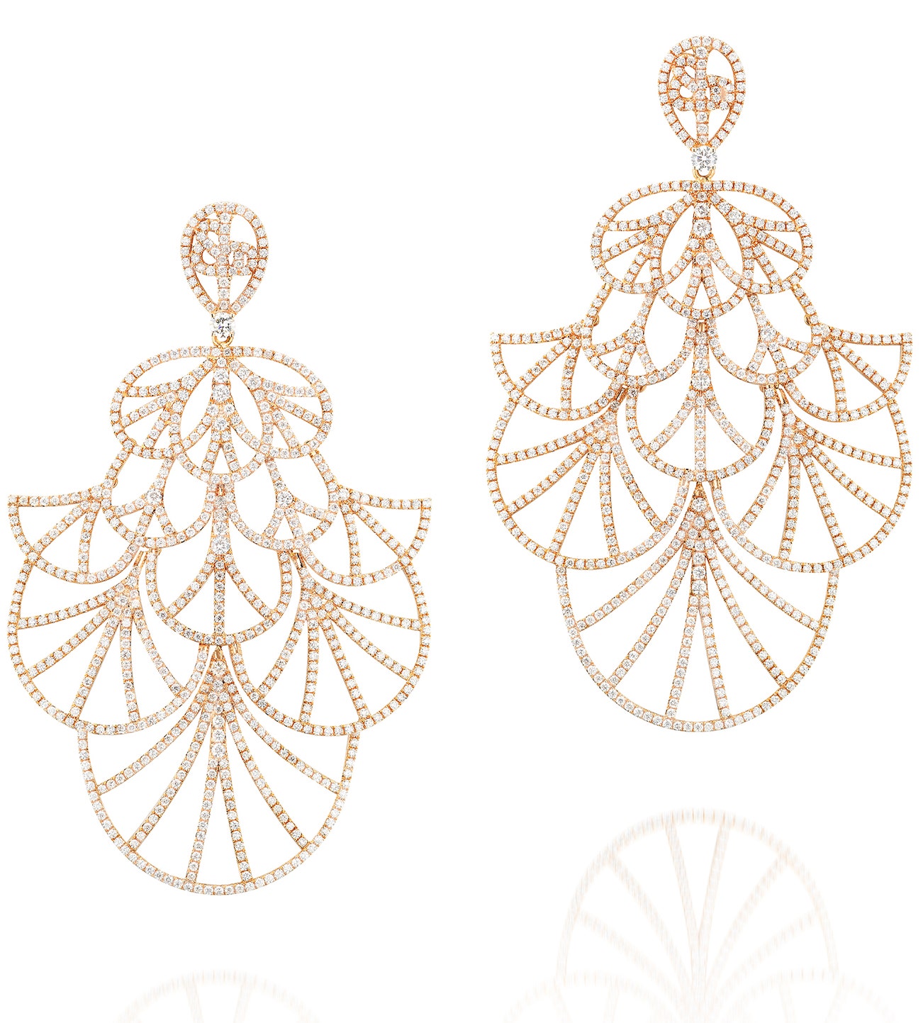 Each designed as an openwork stylized fan motif, set with brilliant-cut diamonds, mounted in pink gold, signed Jacob & Co., numbered, post and hinged back fittings, case stamped Jacob & Co..
