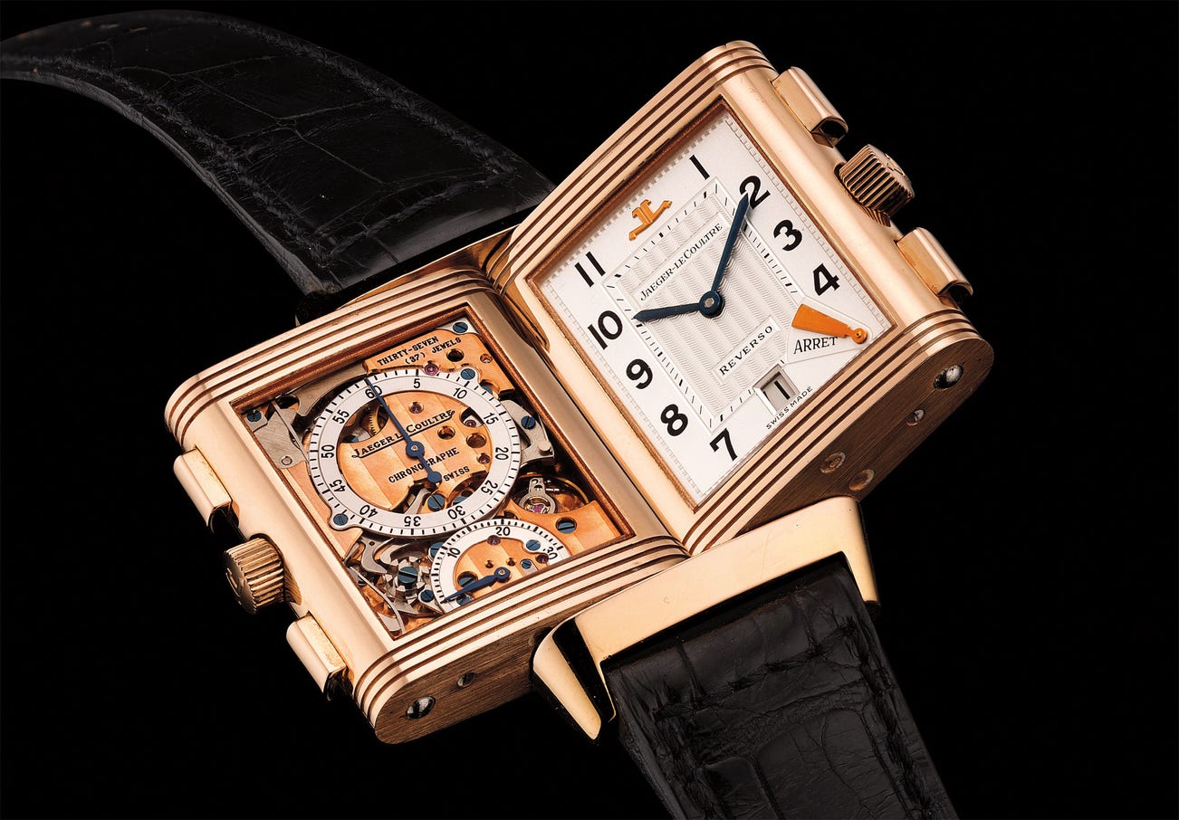積家,「Reverso」型號270.2.69,限量版18K玫瑰金翻轉式腕錶,配兩地時區、計時功能和日期顯示,限量發行500枚,編號第92號,約1997年製。 附錶盒和證書