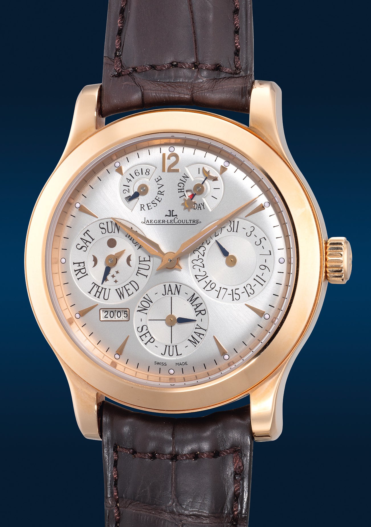積家,「Master Control Eight Day Perpetual Calendar」型號146.2.26S,精細,玫瑰金萬年曆腕錶,備8日動力儲存、日夜、月相、年份顯示,約2004年製。附原裝證書、錶盒