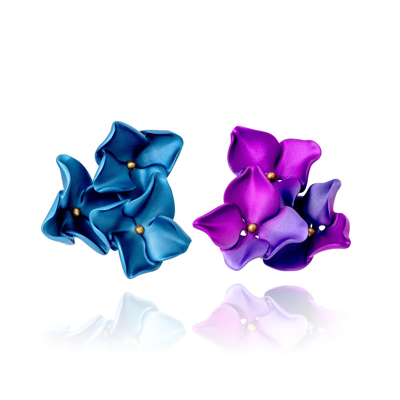 Each designed as three hydrangea flowerheads, one with a purple and violet finish, the other with a blue finish, measuring approximately 55 x 50mm, each signed JAR, numbered, French maker's mark and assay mark for gold, pouch stamped JAR.
