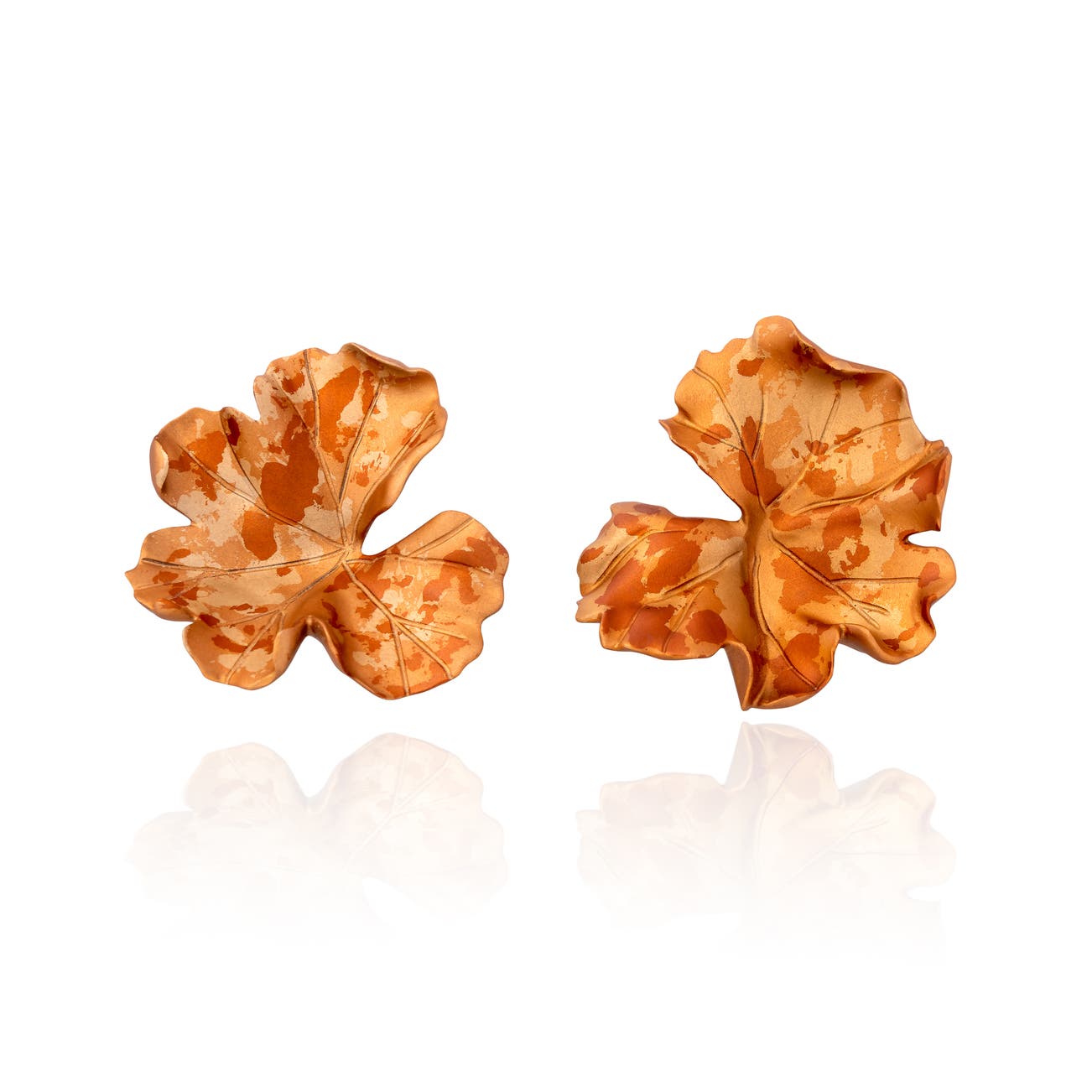 Each designed as a geranium leaf, mottled in shades of orange, measuring approximately 53x48 cm, one signed JAR Paris, each numbered, French maker's mark and assay mark for gold, pouch stamped JAR, hinged-back fittings.