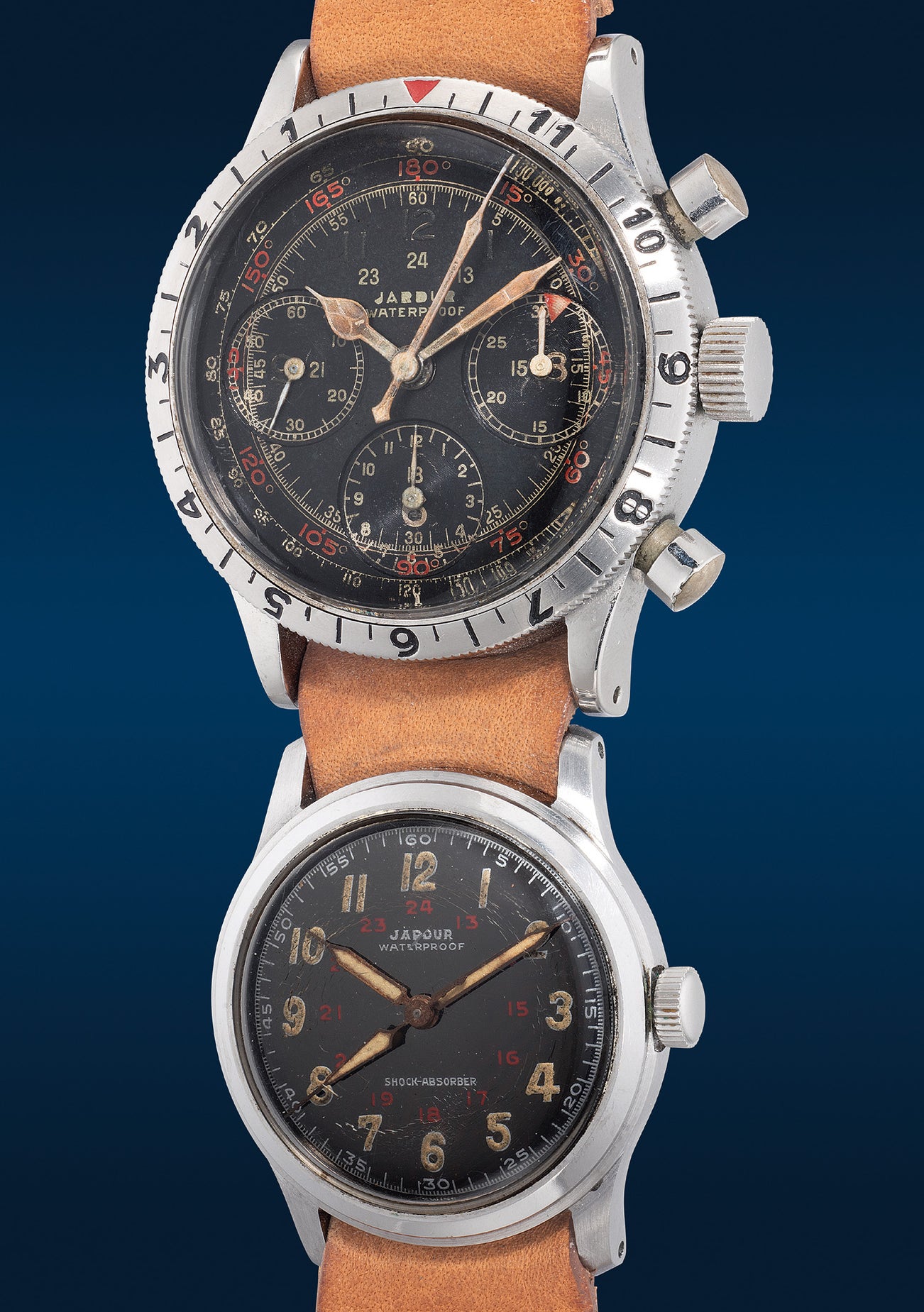 Equally engineered to be functional with finesse, the second Jardur aviator’s wristwatch with 24-hour dial is encased in a much smaller 31.5mm case. The dial is marked by a red 24-hour scale, harmoniously complementing the luminous materials on the hands and Arabic numerals which has aged to a rich tone of toffee. Preserved in great condition, this set of two Jardur aviator’s wristwatches is a fascinating piece of aviation history, and they are perfect for any discerning collectors of pilot's watches.