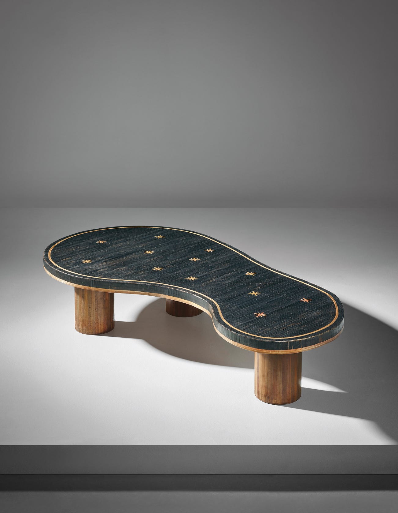 In 1947, for his own residence on the Faubourg-Saint-Honoré in Paris, Royère designed his first pieces of biomorphic furniture, an “Ours Polaire” sofa and a “Flaque” low table. The latter featured an opaline glass top decorated with red stars and supported by three perforated sheet metal legs, positioned in the designer’s living room alongside a carpet whose fluid form echoed that of the low table. A few years later, Royère presented a version of the table with a blue opaline glass top as part of his design for an office lounge at the 1949 Salon des artistes décorateurs. These versions of Royère’s "Flaque" table from the 1940s illustrate the connection to the biomorphic forms developed by designers during the 1930s, such as the series of coffee tables designed by Gray with irregularly shaped wooden or metal tops on tubular steel frames.