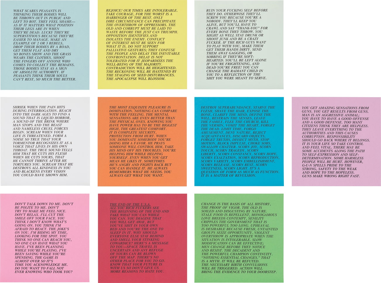 American | 1950Jenny Holzer is a Conceptual artist best known for her text-based public art projects. Holzer's work speaks of violence, oppression, sexuality, feminism, power, war and death. Throughout the years, Holzer has employed a variety of media, from a T-shirt to a plaque to an LED sign. Starting in the 1970s with the New York City posters, and continuing through her recent light projections on landscape and architecture, she uses her art as a form of communication and commentary. Holzer's art hangs in important collections around the globe including 7 World Trade Center, the Venice Biennale, the Guggenheim Museums in New York and Bilbao and the Whitney Museum of American Art.
