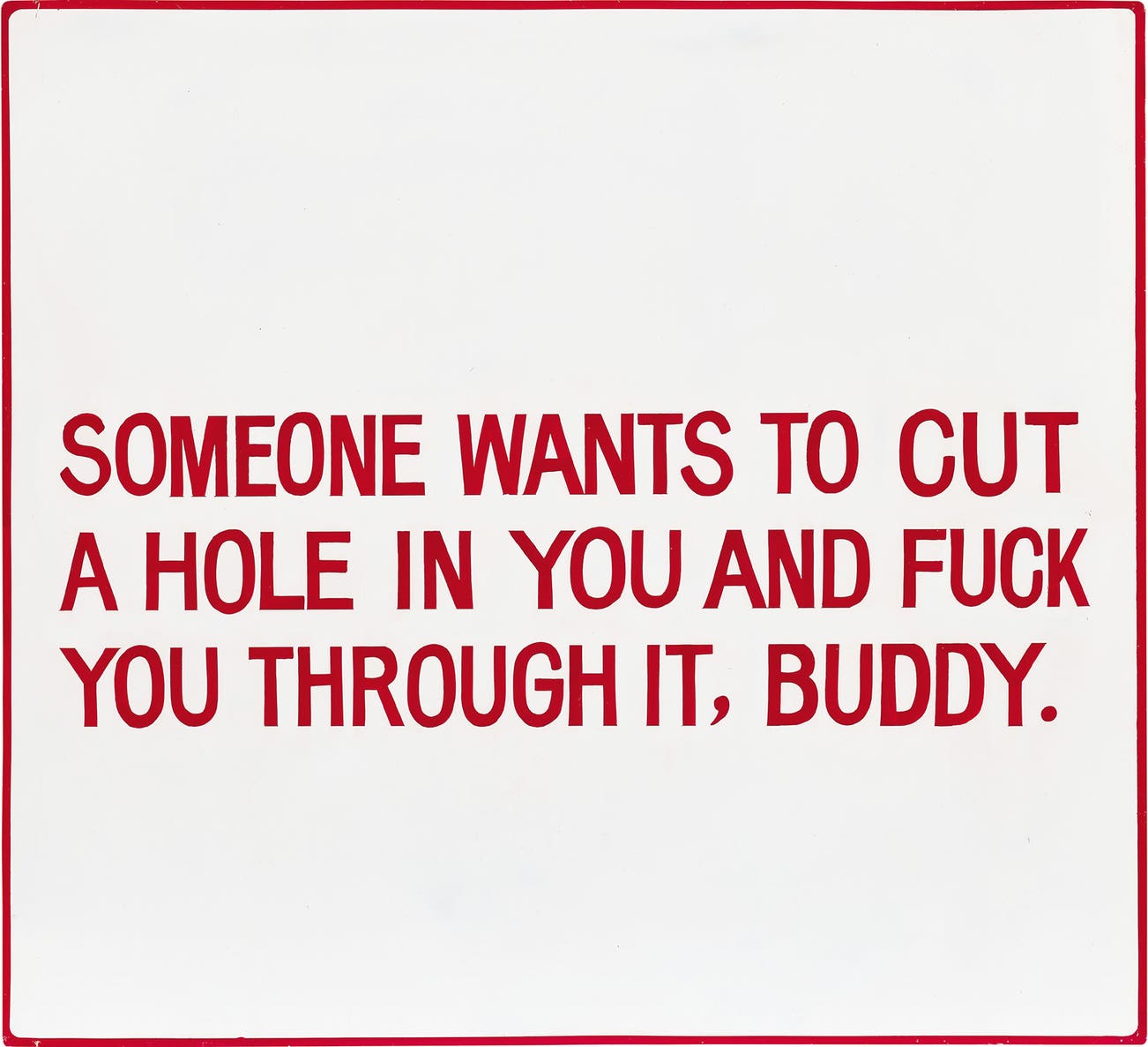 American | 1950Jenny Holzer is a Conceptual artist best known for her text-based public art projects. Holzer's work speaks of violence, oppression, sexuality, feminism, power, war and death. Throughout the years, Holzer has employed a variety of media, from a T-shirt to a plaque to an LED sign. Starting in the 1970s with the New York City posters, and continuing through her recent light projections on landscape and architecture, she uses her art as a form of communication and commentary. Holzer's art hangs in important collections around the globe including 7 World Trade Center, the Venice Biennale, the Guggenheim Museums in New York and Bilbao and the Whitney Museum of American Art.