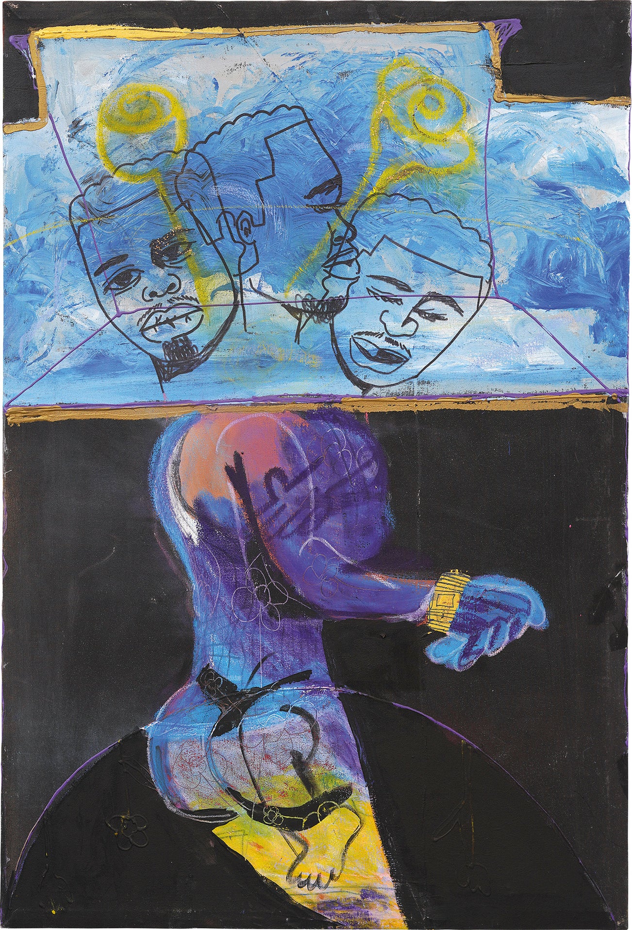 年輕畫家喬納森·林登·蔡斯現居費城,他經常突破新的領域,在其混合媒材作品中以創新手法探討種族、性別和性的問題,突出他自己作為一名身處當今美國社會的同性戀黑人,所遇到的掙扎。 他在畫面上呈現了一個無重力的廣闊空間,本幅作品所畫的是三個側面的全身像,他們一點點融入彼此的身體邊界,曲線玲瓏,四肢富彈性,仿佛是鎖在背景藍色和黑色間的一個肉體狂喜時刻。蔡斯為此作選擇的題目機智地向希臘女神赫卡忒致敬,赫卡忒包含了少女、母親和老婦三位一體。但蔡斯的作品通過其雌雄同體而挑戰性別概念,有著強烈的當代感。如赫卡忒一般,經歷過去、現在和未來的不同層面。這些人物蘊藏的情感深摯,就像一扇窗,看向藝術家自己的人生,甚至可以把它視為一幅自畫像,蔡斯在其中承認自己的躁狂抑鬱症。藝術家解釋道:「我眼中這個世界的高潮和低潮有時會讓人很不知所措,但有時又是非常美麗的。它幫助我以不同方法對細小差異保持敏感度。」(藝術家,錄於Miss Rosen,《這位藝術家畫了一些關於同性戀生活的美麗、淫穢的故事》,〈Dazed〉,2018年4月26日,截自網路)《赫卡忒》是時間的流逝,還有藝術家通過身體感到的焦慮、痛苦和愉悅,既赤裸又真實。蔡斯2018年在 Kohn 畫廊的首次畫展在一天內就全部售罄。其作品現已被納入美國明尼亞波利斯的沃克藝術中心和邁阿密當代藝術中心的收藏。同時, 也進入Beth DeWoody 和 Hort 家族的私人收藏。