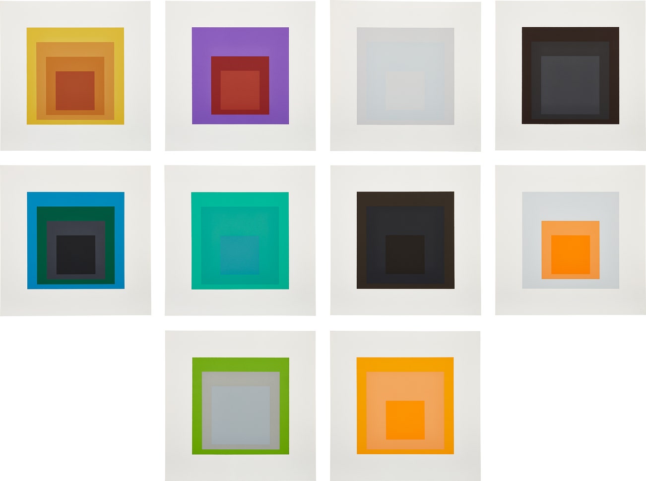 全套10組絲印版畫 Rives BFK 紙本(全包邊)顏色明亮清新,每組存於印有標題的紙製文件夾,附藝術家文本、標題頁、版權頁,全部存於原裝黑色布面文件夾及光滑黑卡書套