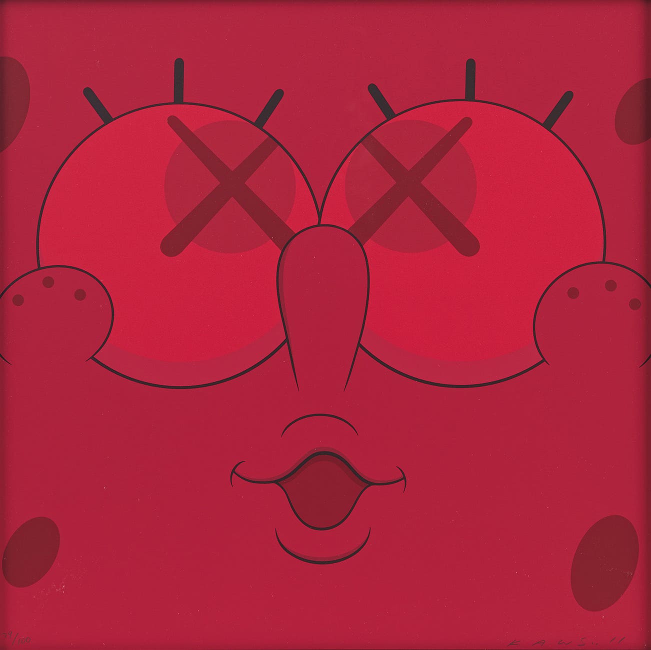 Perhaps he is most known for his larger-than-life fiberglass sculptures that supplant the body of Mickey Mouse onto KAWS' own imagined creatures, often with 'x'-ed out eyes or ultra-animated features. However, KAWS also works frequently in neon and vivid paint, adding animation and depth to contemporary paintings filled with approachable imagination. There is mass appeal to KAWS, who exhibits globally and most frequently in Asia, Europe and the United States.