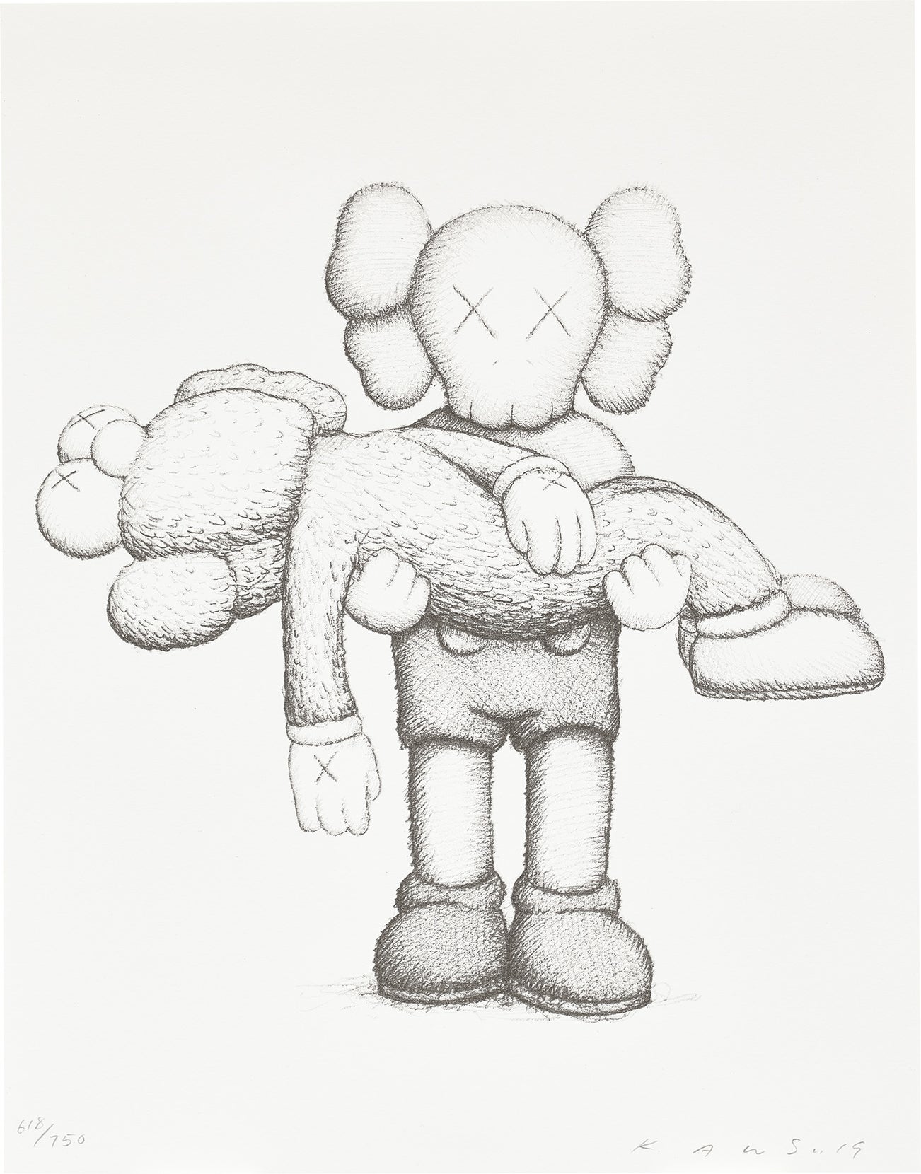 Perhaps he is most known for his larger-than-life fiberglass sculptures that supplant the body of Mickey Mouse onto KAWS' own imagined creatures, often with 'x'-ed out eyes or ultra-animated features. However, KAWS also works frequently in neon and vivid paint, adding animation and depth to contemporary paintings filled with approachable imagination. There is mass appeal to KAWS, who exhibits globally and most frequently in Asia, Europe and the United States.