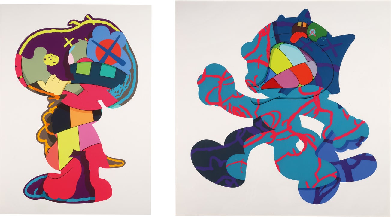 Perhaps he is most known for his larger-than-life fiberglass sculptures that supplant the body of Mickey Mouse onto KAWS' own imagined creatures, often with 'x'-ed out eyes or ultra-animated features. However, KAWS also works frequently in neon and vivid paint, adding animation and depth to contemporary paintings filled with approachable imagination. There is mass appeal to KAWS, who exhibits globally and most frequently in Asia, Europe and the United States.