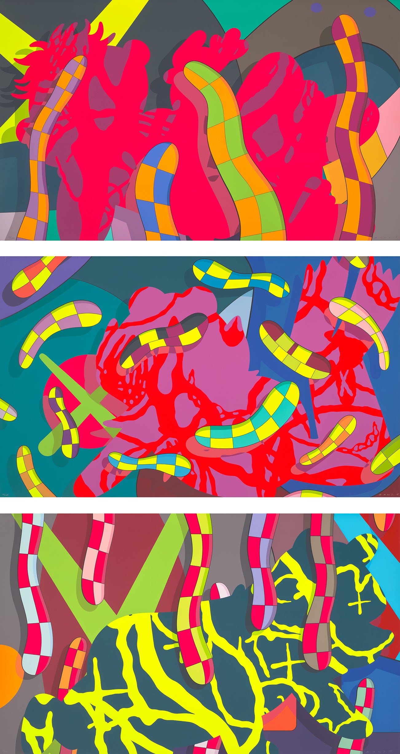 Perhaps he is most known for his larger-than-life fiberglass sculptures that supplant the body of Mickey Mouse onto KAWS' own imagined creatures, often with 'x'-ed out eyes or ultra-animated features. However, KAWS also works frequently in neon and vivid paint, adding animation and depth to contemporary paintings filled with approachable imagination. There is mass appeal to KAWS, who exhibits globally and most frequently in Asia, Europe and the United States.