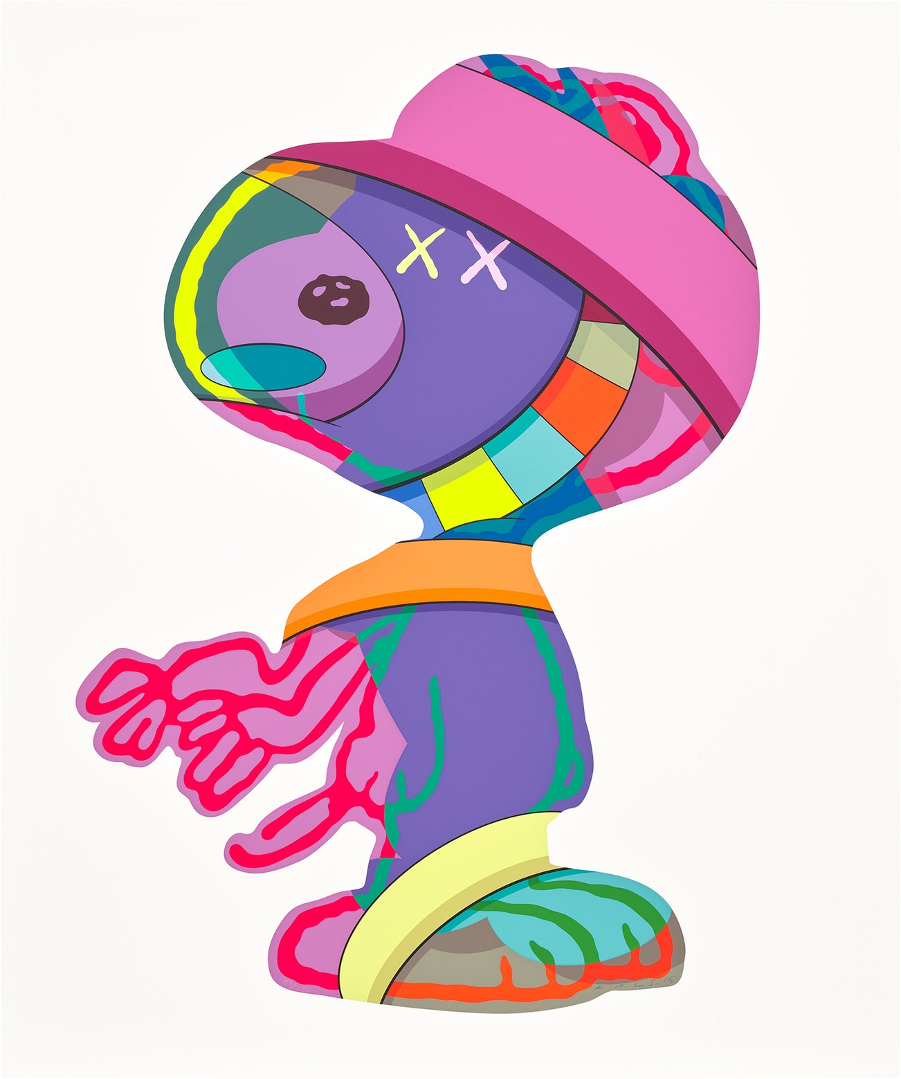 Perhaps he is most known for his larger-than-life fiberglass sculptures that supplant the body of Mickey Mouse onto KAWS' own imagined creatures, often with 'x'-ed out eyes or ultra-animated features. However, KAWS also works frequently in neon and vivid paint, adding animation and depth to contemporary paintings filled with approachable imagination. There is mass appeal to KAWS, who exhibits globally and most frequently in Asia, Europe and the United States.