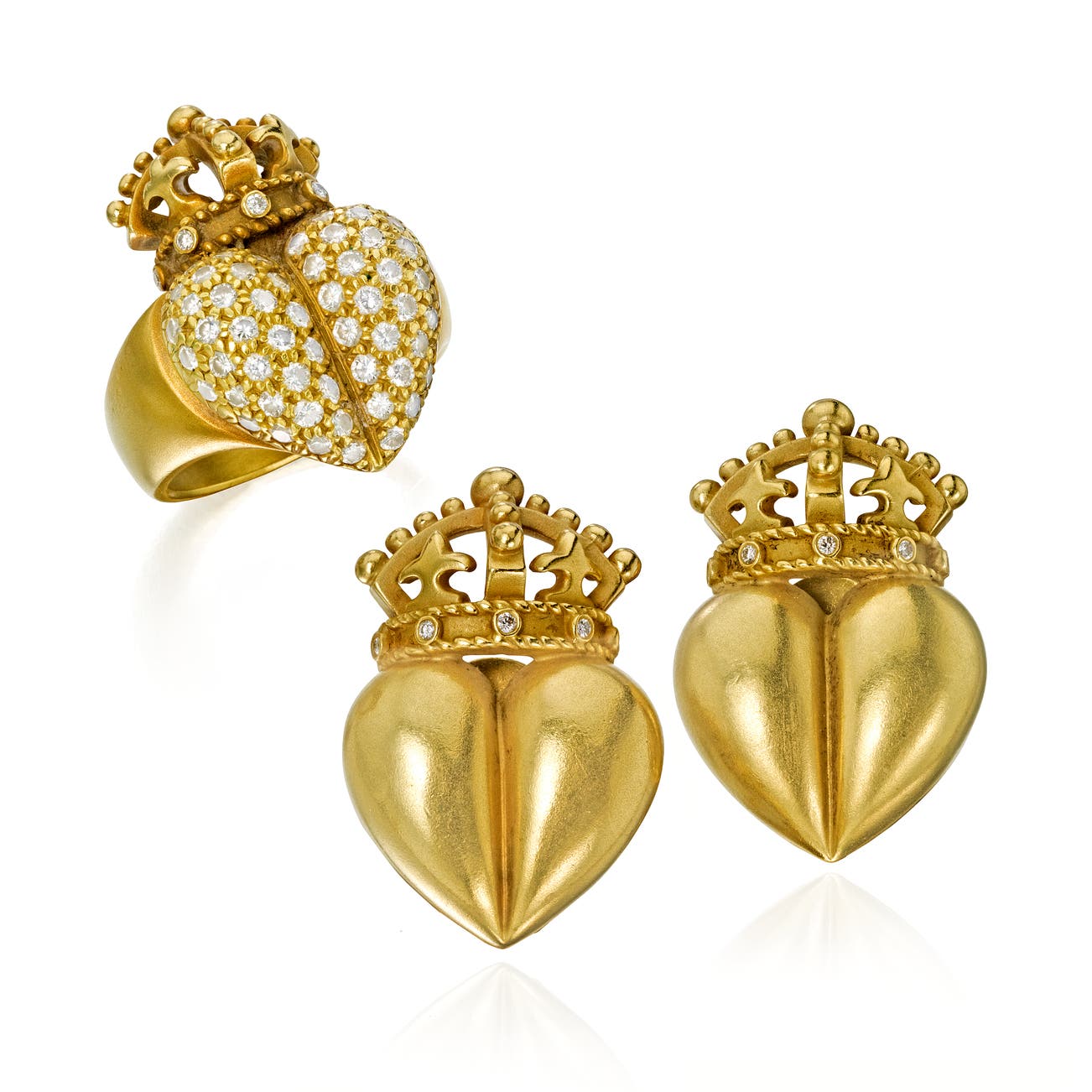 Pair of Gold Earrings and Ring, 'Crown Heart'