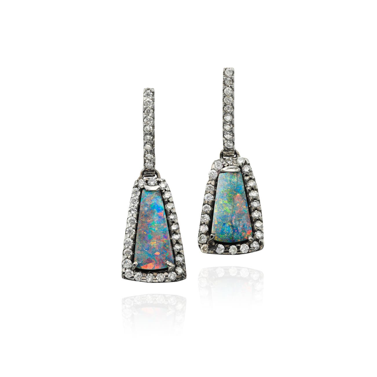 Each set with an opal, accented by brilliant-cut diamonds, suspended from a line of brilliant-cut diamonds, mounted in 18k white gold, length approximately 1 1/4 inches.