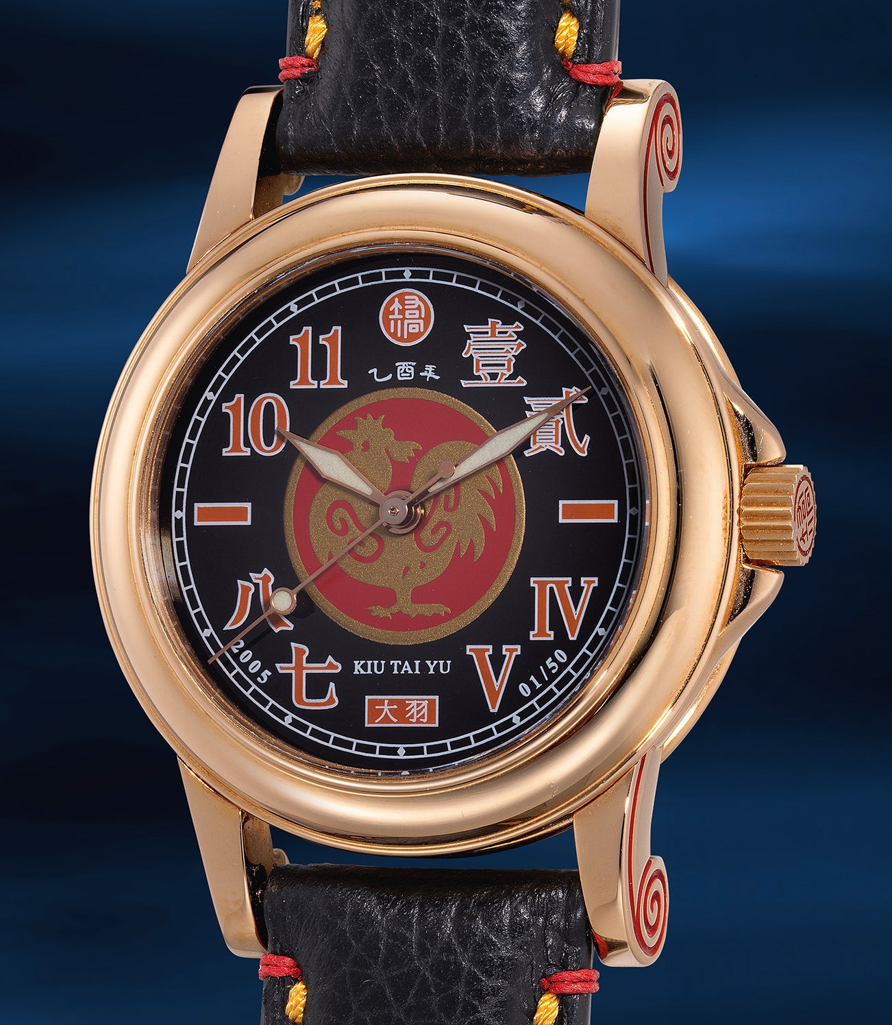 矯大羽,「Year of the Rooster Commemoration」型號 ,獨特罕有,玫瑰金自動腕錶,備中國生肖圖案,特為紀念2005年乙酉雞年限量發行50枚,編號第1枚,約2005年製。附錶盒