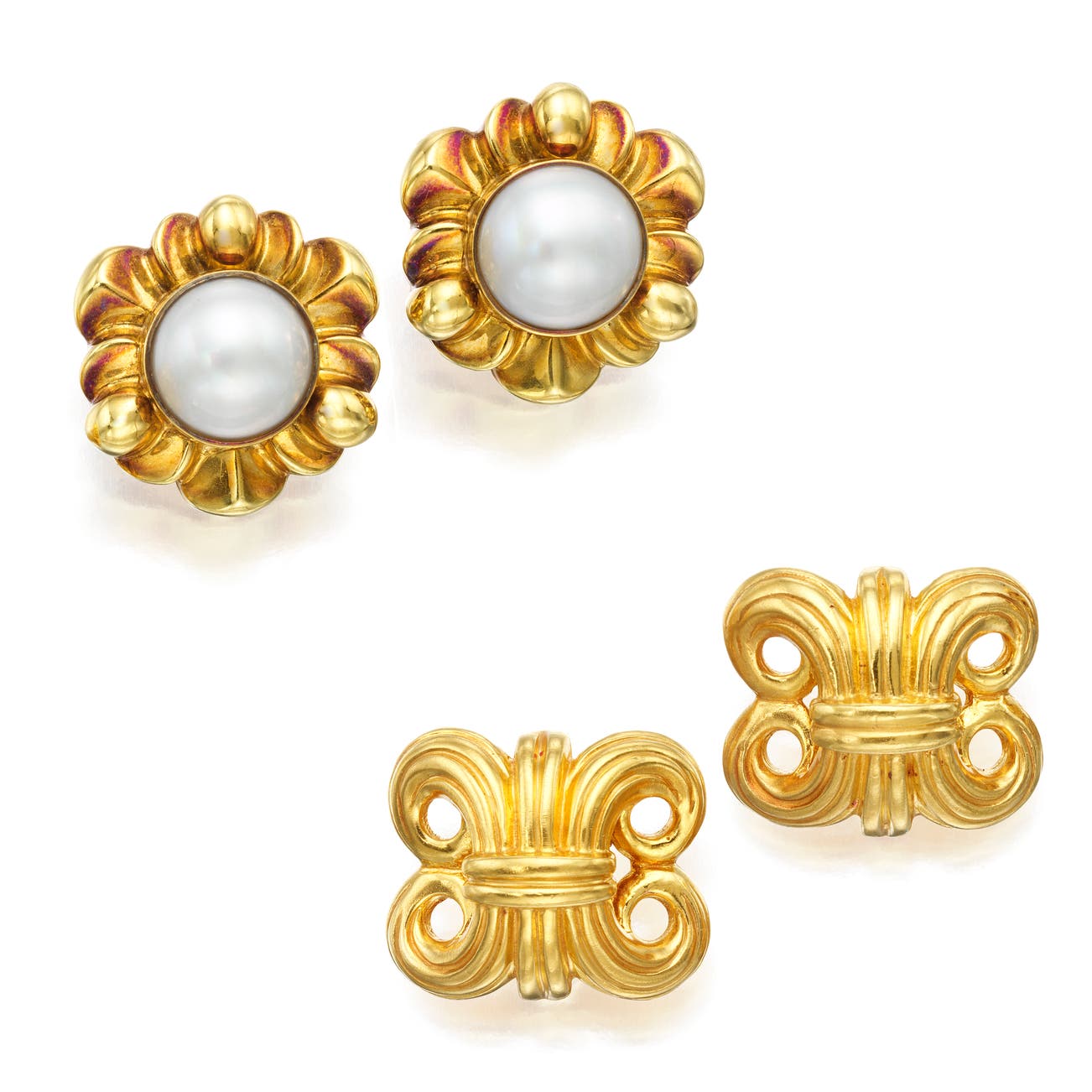 One pair set with pearls, mounted in 18k yellow gold, measuring approximately 7/8 inches, signed Lagos, numbered, one pair, in 22k yellow gold, measuring approximately 3/4 inches, signed Lagos.