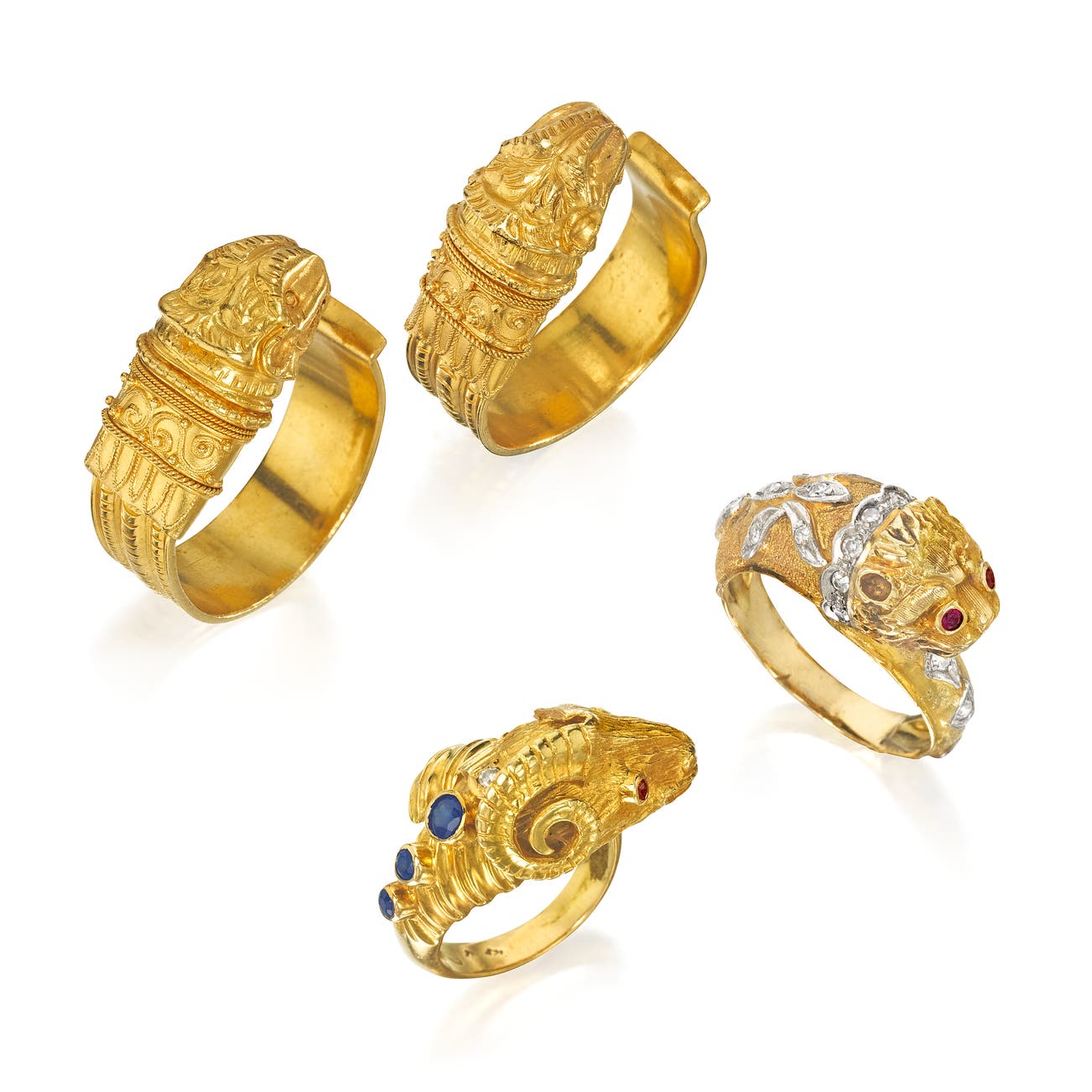 One ring set with circular-cut sapphires, ruby eyes and a single-cut diamond, mounted in 18k yellow gold, size 5 1/2, with maker's mark for Lalaounis, one ring set with single-cut diamonds and circular-cut ruby eyes, mounted in yellow gold, size 6, signed Ilias Lalaounis, one pair of earrings, in 18k yellow gold, measuring approximately 1 1/2 inches, signed Ilias Lalaounis, with maker's mark for Lalaounis.