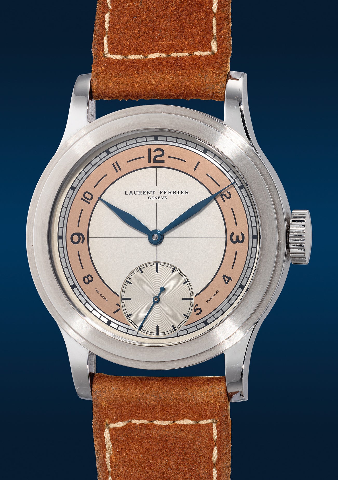 To further pay homage to watches from that era, Laurent Ferrier incorporated a vintage-inspired logo with a typeface reminiscent of the 1940s. Additionally, the text "Fab. Suisse" and "Swiss Made" located at 6 o'clock are reminiscent of the "double Swiss" dials commonly seen in mid-20th century timepieces.