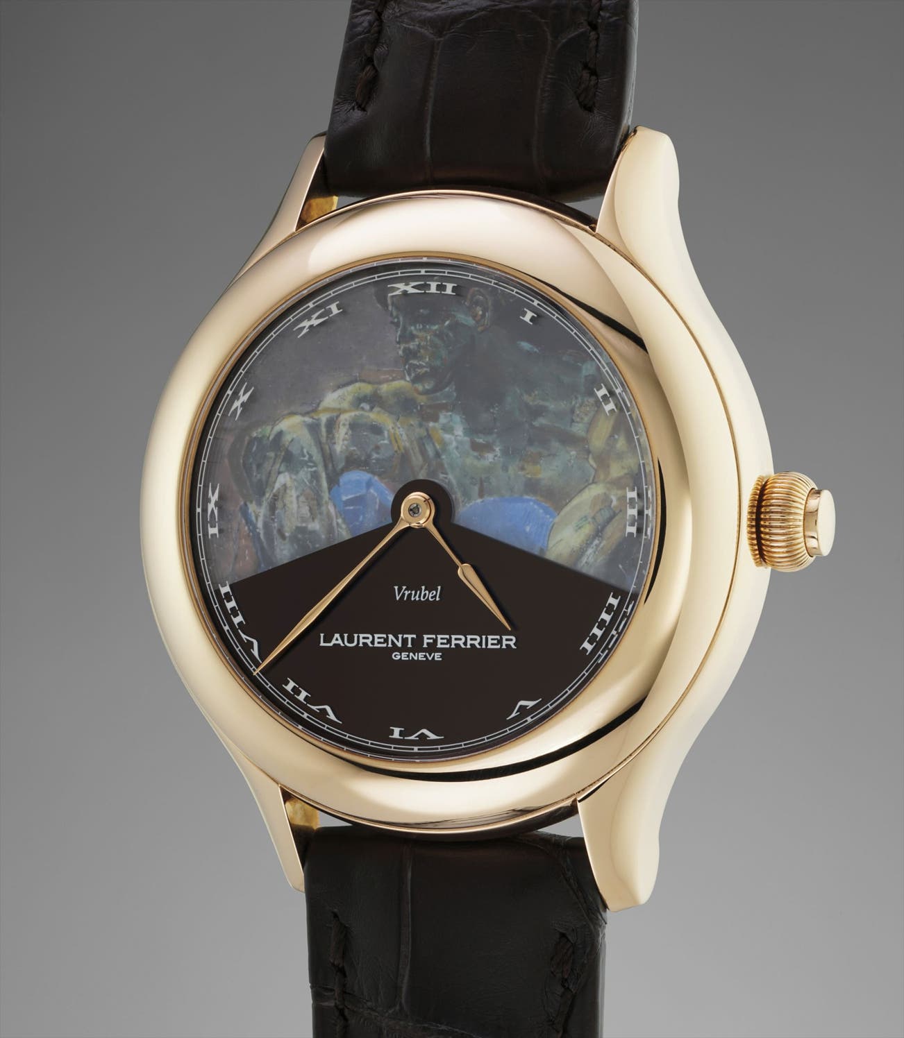 The dial side nevertheless has nothing to shy from as it is a true work of art in all senses. As the name implies the present watch hides a secret behind the tinted sapphire dial. A complex device pivots the dial’s two opaque crystals at a full 240° like a fan opening to reveal a grand feu enamel dial representing Mikhail Vrubel “Demon Seated”.