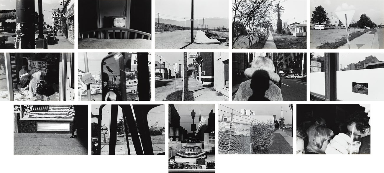 Titles include : T.V. in hotel room--Galax, Virginia, 1962; Bed in window--Cincinnati, Ohio, 1963; Women in window--New York City, 1963; Man in window--New York City, 1964; Plane over Bull--Kansas City, Missouri, 1965; Flag--New York City, 1965; Shadow--New York City, 1966; Party--New York City, 1968; Filling Station-- rear view mirror--Hillcrest, New York, 1970; Lee Av--Butte, Montana, 1970; Car & fence & bush--San Diego, California, 1970; Street scene, tress & houses--Hollywood, California, 1970; Statue--New Jersey, 1971; House, trailer, sign, cloud--Knoxville, Tennessee, 1971; Street scene--man, pole, etc.--Chicago, 1972
