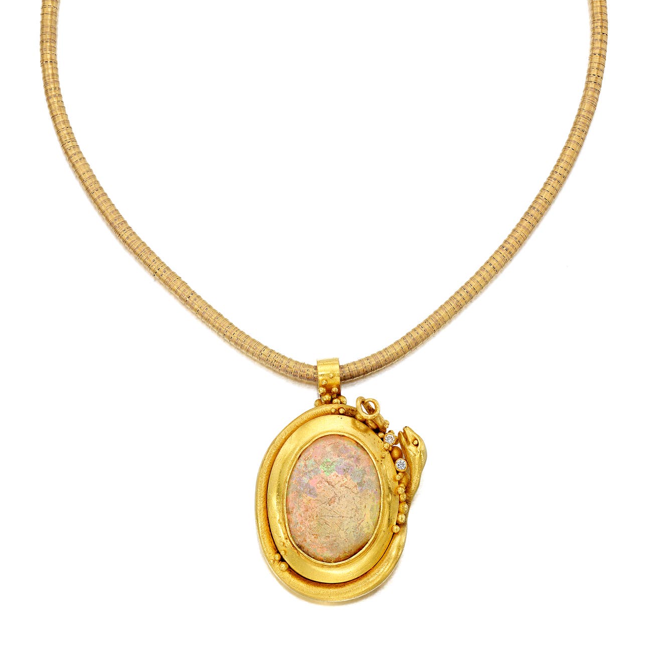 Of serpent design, the pendant set with an opal, accented by brilliant-cut diamonds, mounted in 22k yellow gold, length approximately 2 inches, unsigned, suspending from a necklace, mounted in 18k yellow gold, length approximately 16 1/2 inches, signed Yvel.