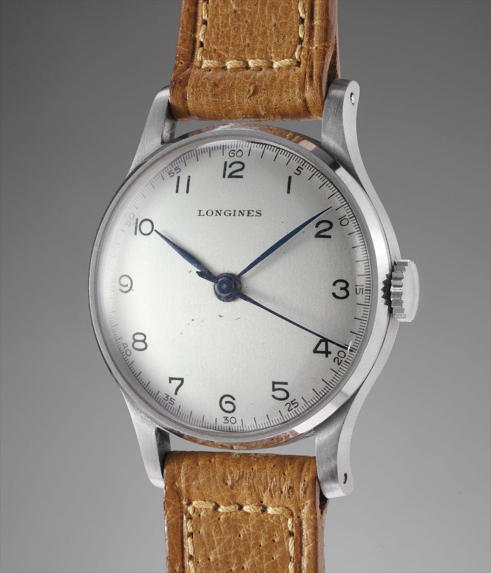Accompanied by Longines fitted box, hangtag and Extract from the Archives confirming the present watch was invoiced on 18 December 1948 to the company Hausammann, which was Longines’ agent for Sweden and Norway at that time.
