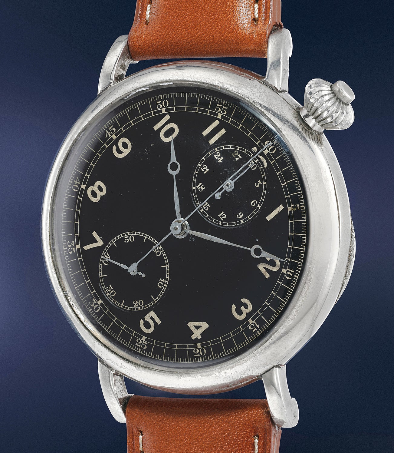 Launched before World War II, these single pusher chronographs were initially produced for aviators with the dial set at an angle so the time could be read easily while piloting. A single button pusher incorporated into the crown allowed the pilot to easily start, stop and reset the chronograph to zero.