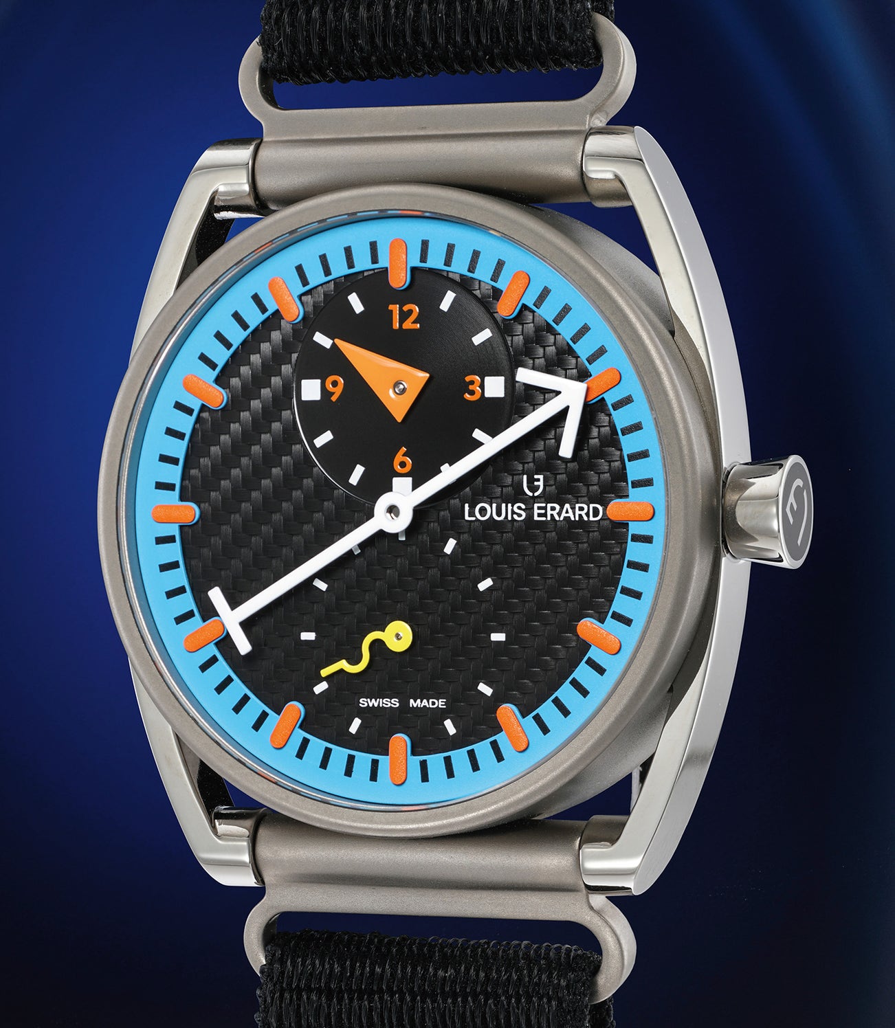 The dial is in carbon fiber with orange indexes and a light blue outer track. An orange triangle indicates the hours on a subdial at 12 o’clock, a large central white arrow hand indicates the minutes and a small swirly yellow seconds hand is located at 6 o’clock. Indeed, trained as an interior architect and designer, one can’t help but notice the influences of painters such as Paul Klee, Kandinsky, Malevitch or their contemporary Keith Haring in the creation of this sophisticated timepiece.