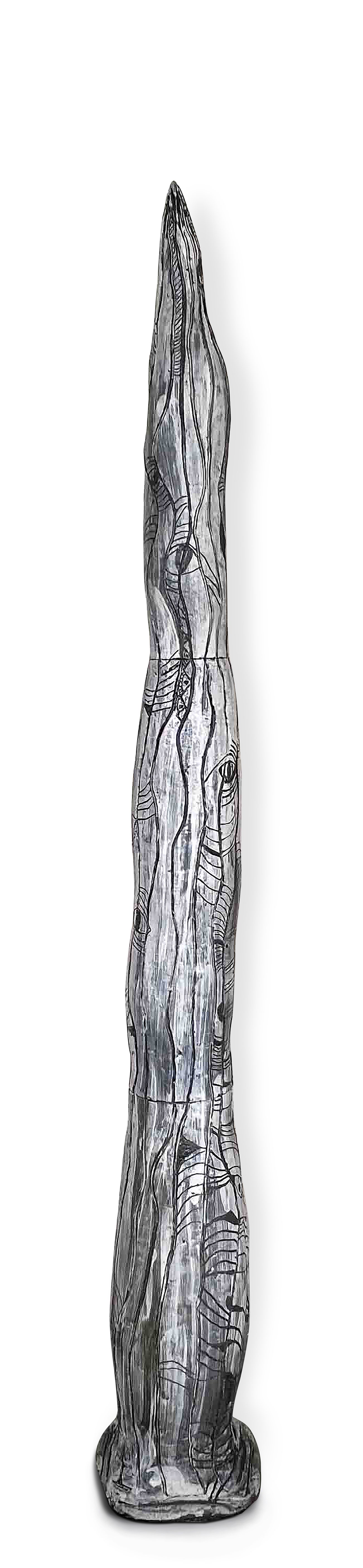 Meditating on the hidden life and power found within trees, Madhvi Subrahmanian was deeply inspired by Peter Wohlleben’s book, The Hidden Life of Trees, in which he writes, “A magical world… trees with human faces, trees that can talk, and sometimes walk.” This large ceramic trunk is made using a special black clay found in Shigaraki, Japan. The gnarly knots in the tree’s bark are transformed into eyes, which suggest that the tree gazes at others just as it is being observed.