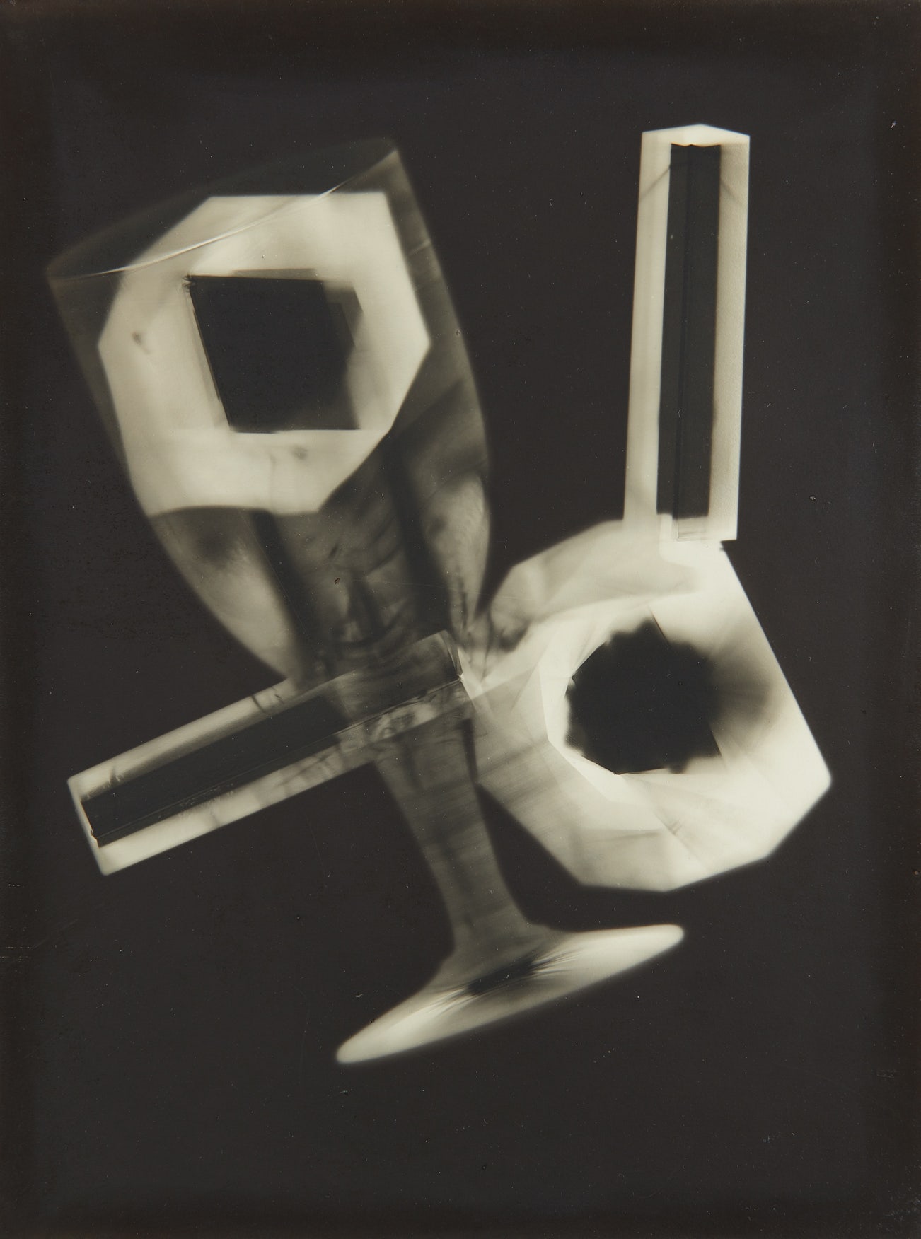 This unique rayograph, created by Man Ray when he first began working with the photogram technique, depicts a stemmed glass and several prism shaped objects. Viewers are lured into the image’s rhapsodic space in which the ordinary becomes extraordinary. It is not a mechanical copy of nature, but a new and exciting pictorial adventure.