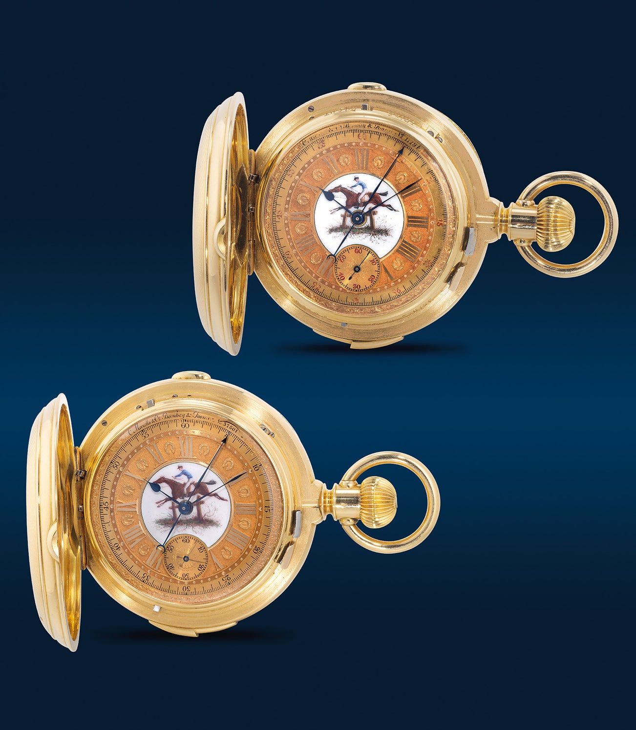 Marcks & Co., Bombay & Poona, 一對極為罕有、可能獨一無二 , 黃金大自鳴計時獵錶無匙懷錶,備琺瑯微繪,第一枚備三問報時及備第二枚備七分半問報時,專為印度市場打造,約1890年製