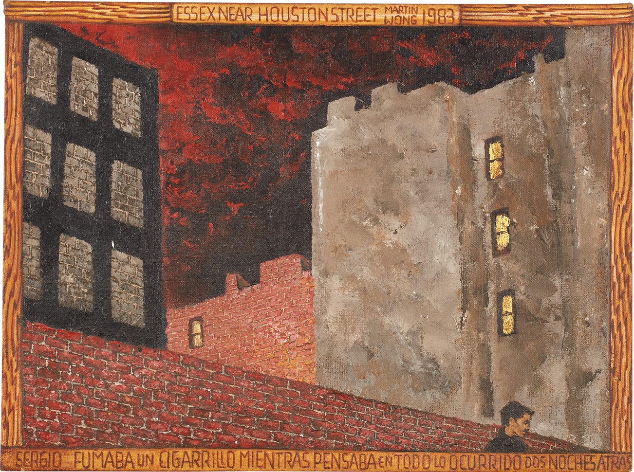 款識:ESSEX NEAR HOUSTON STREET MARTIN WONG 1983(上方邊緣)SERGIO FUMABA UN CIGARRILLO MIENTRAS PENSABA EN TODO LO OCCURRIDO DOS NOCHES ATRAS(下方邊緣)