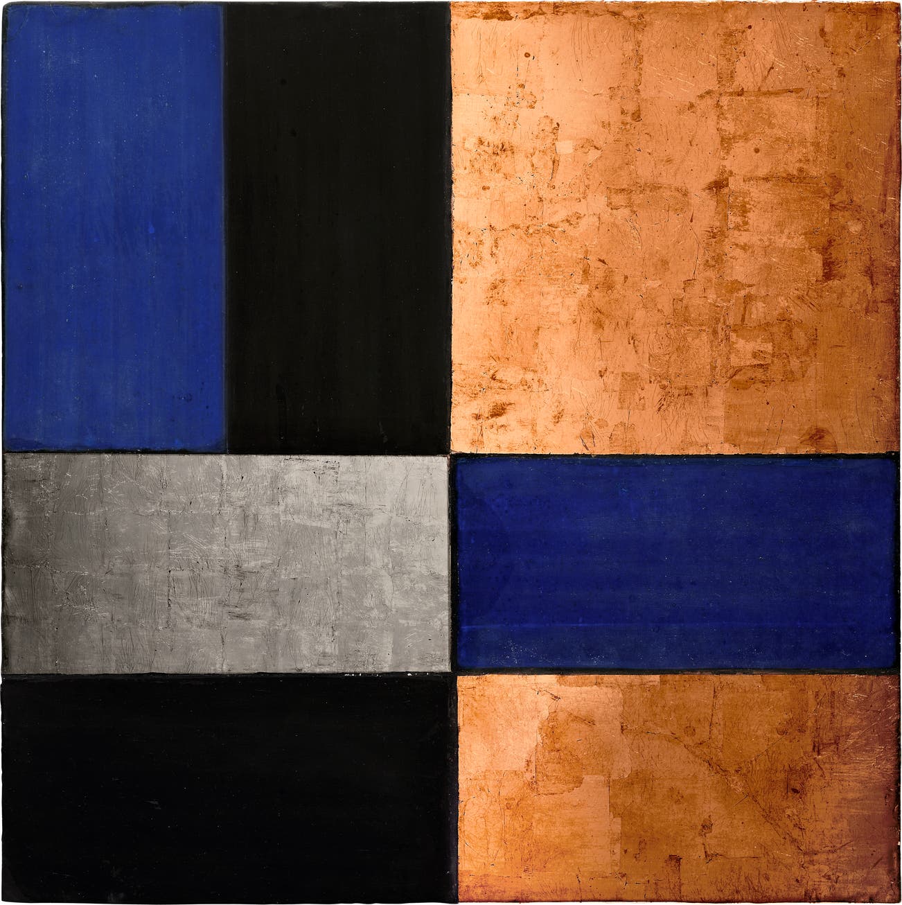 egg tempera, copper lead and aluminum leaf on gessoed panel